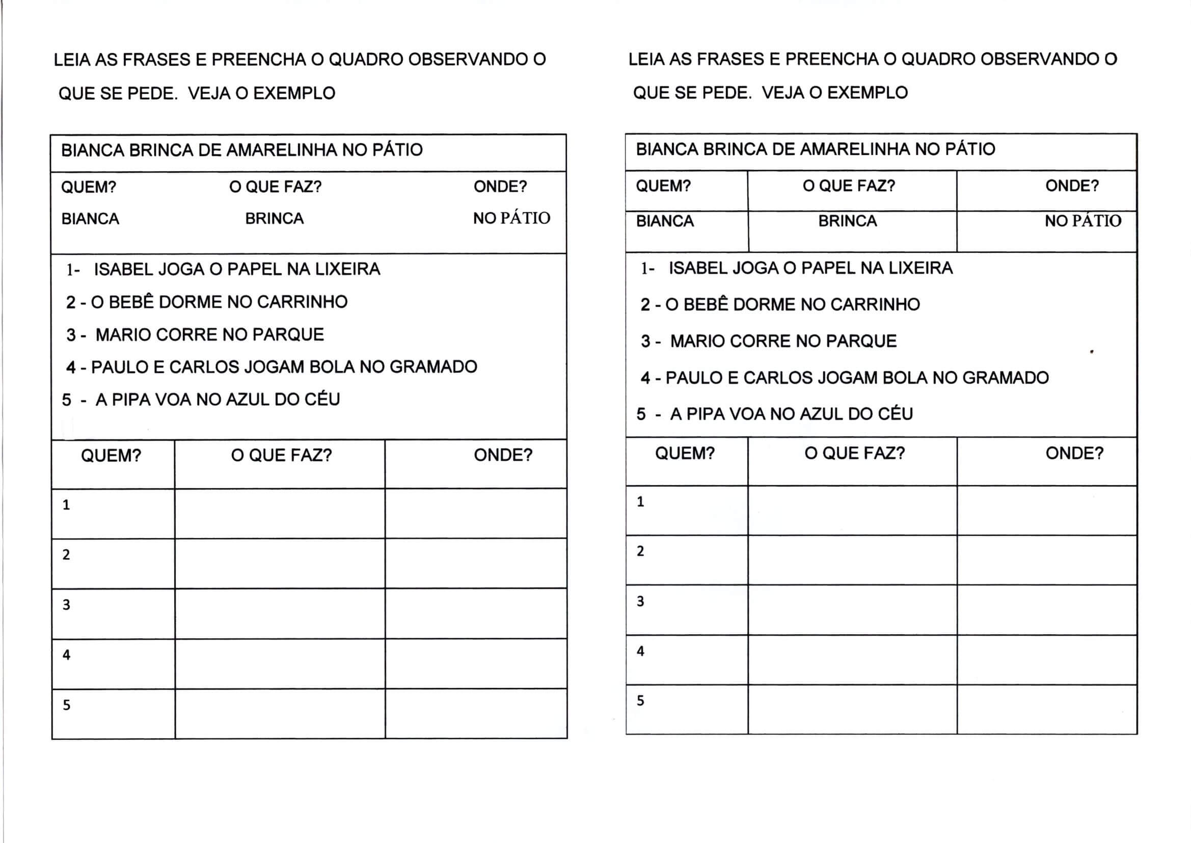 Frases-Quem-O que e Quando. Atividade para ler as frases e preeencher os quadros corretamente conforme as orientações do que acontece, quando e onde.