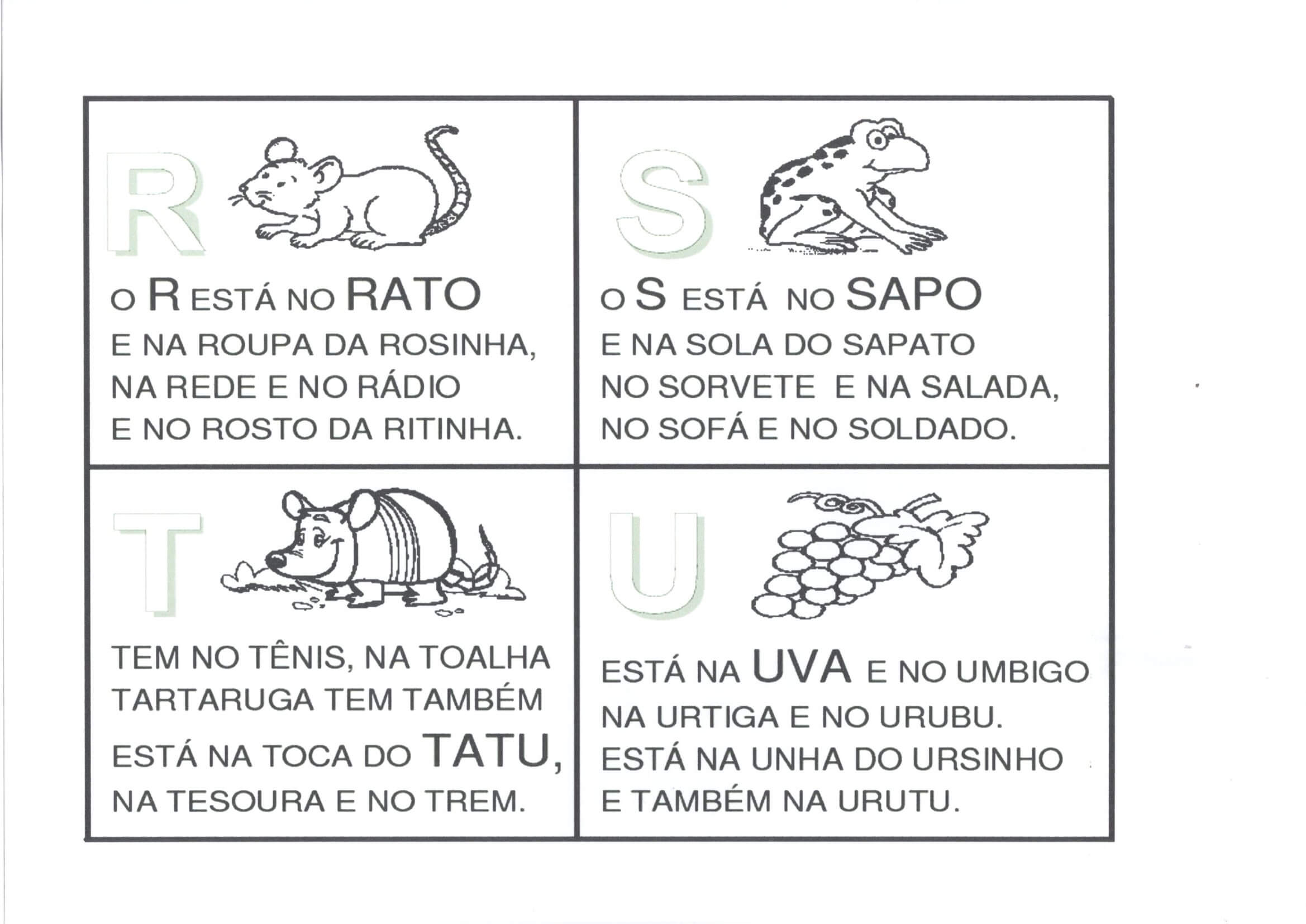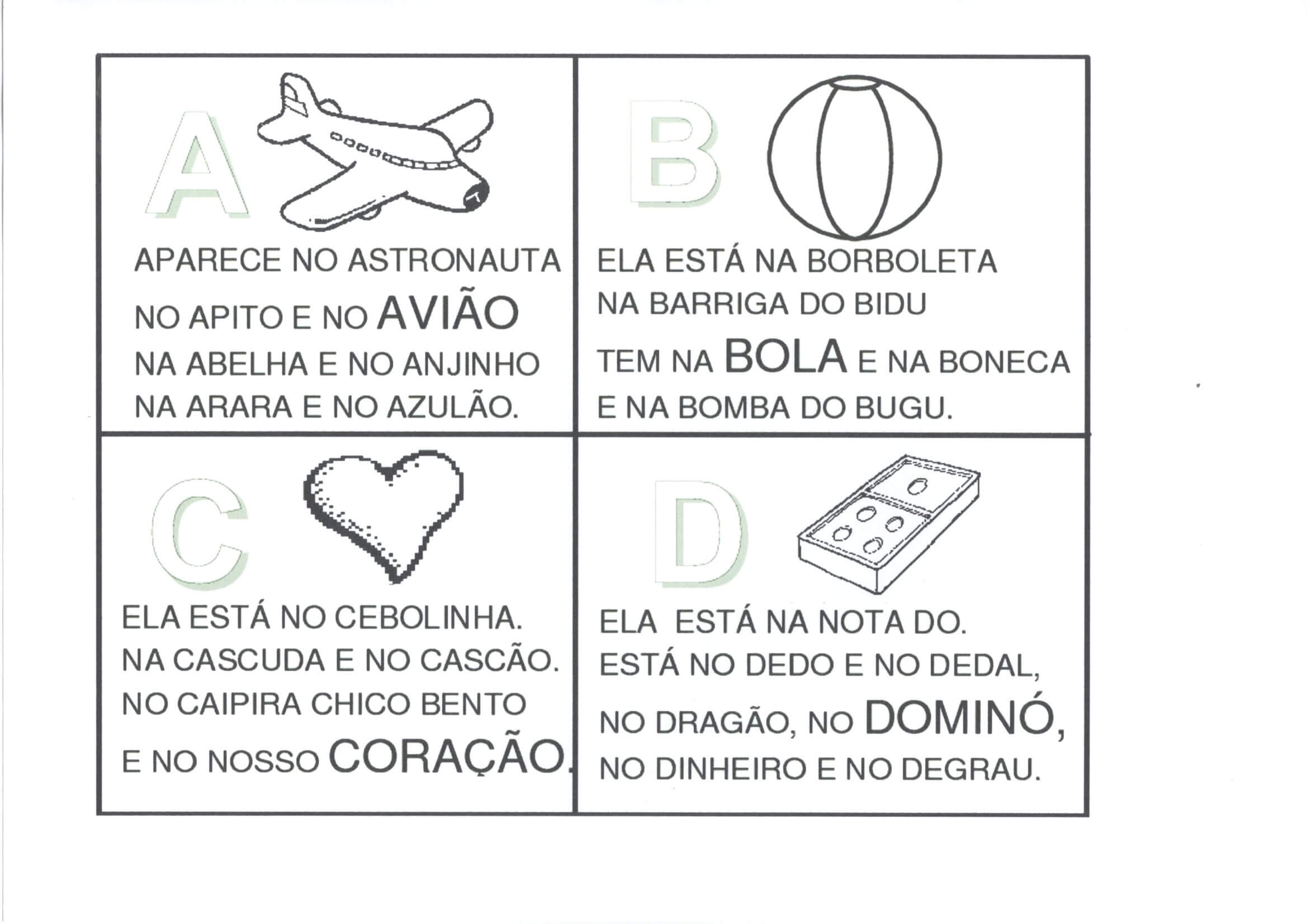 Alfabeto com Versinhos-Parte 1-De A a M. Alfabeto com os quadros das letras formando versinhos para melhor memorização. Não tem a letra K.