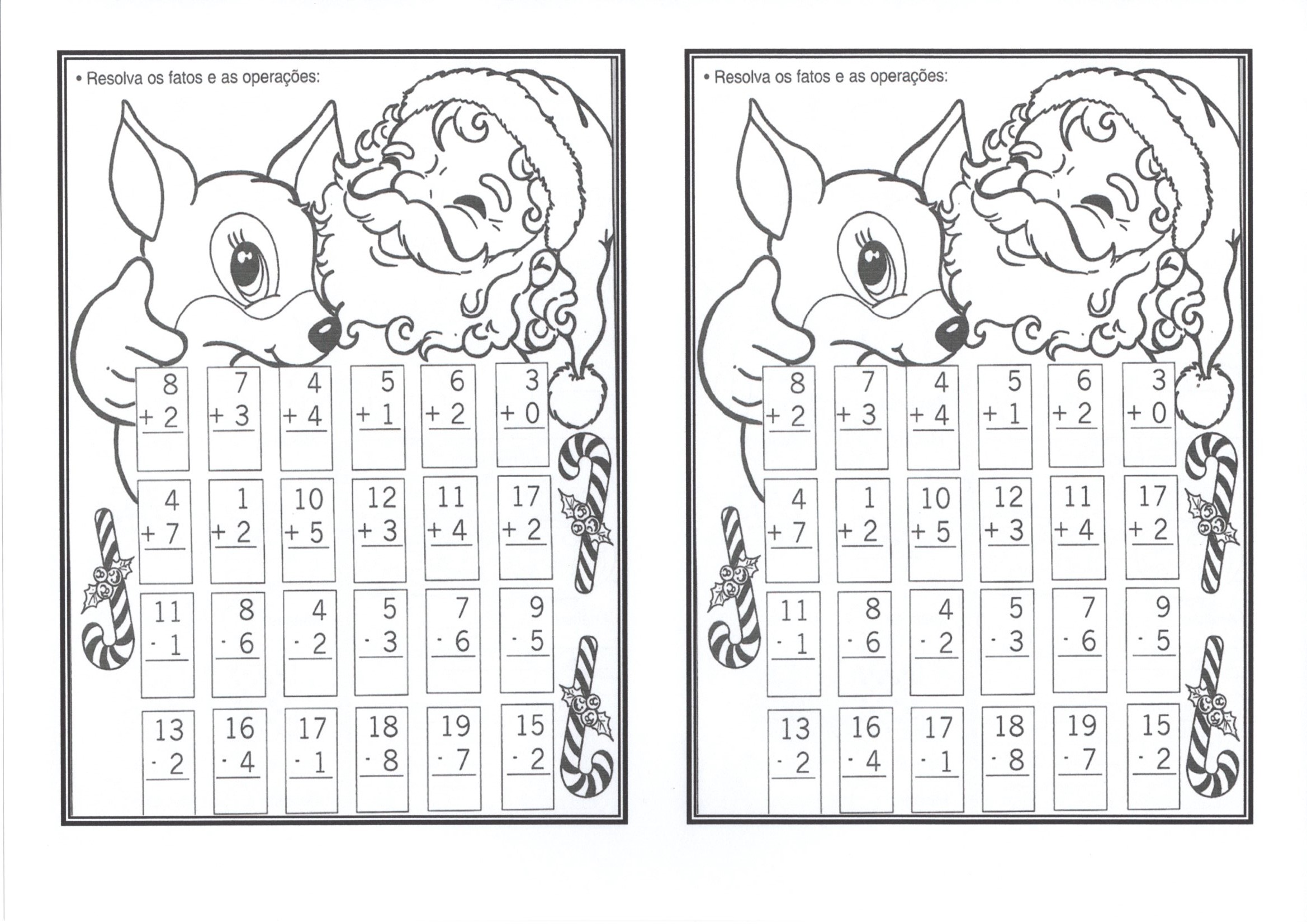 Adição e Subtração com Tema do Natal. Atividade de Adição que usa o tema do Natal com continhas prontas para somar na folha impressa.