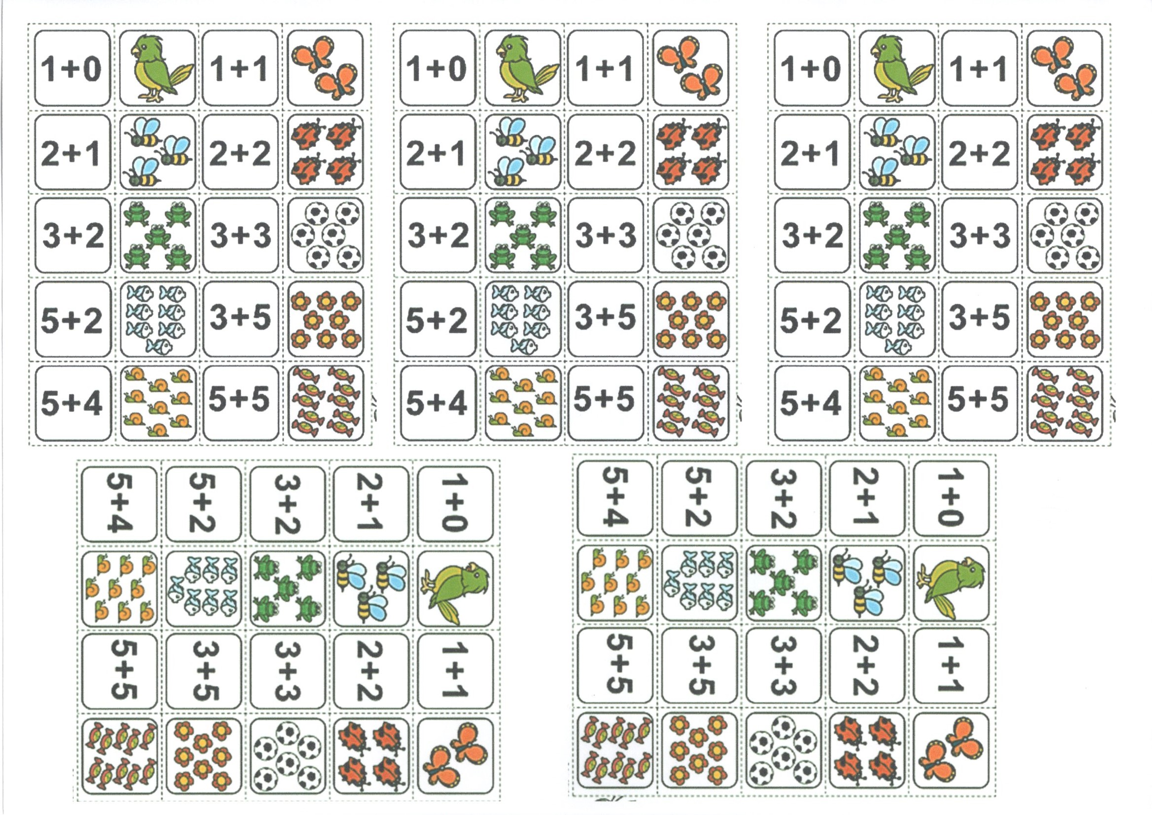 Jogo da Memória Colorido-Adição. Com este Jogo da Memória Colorido é possível aprender Adição de forma lúdica. Cada página tem 5 jogos. Atividade de Ensino Fundamental pronta para imprimir e usar.