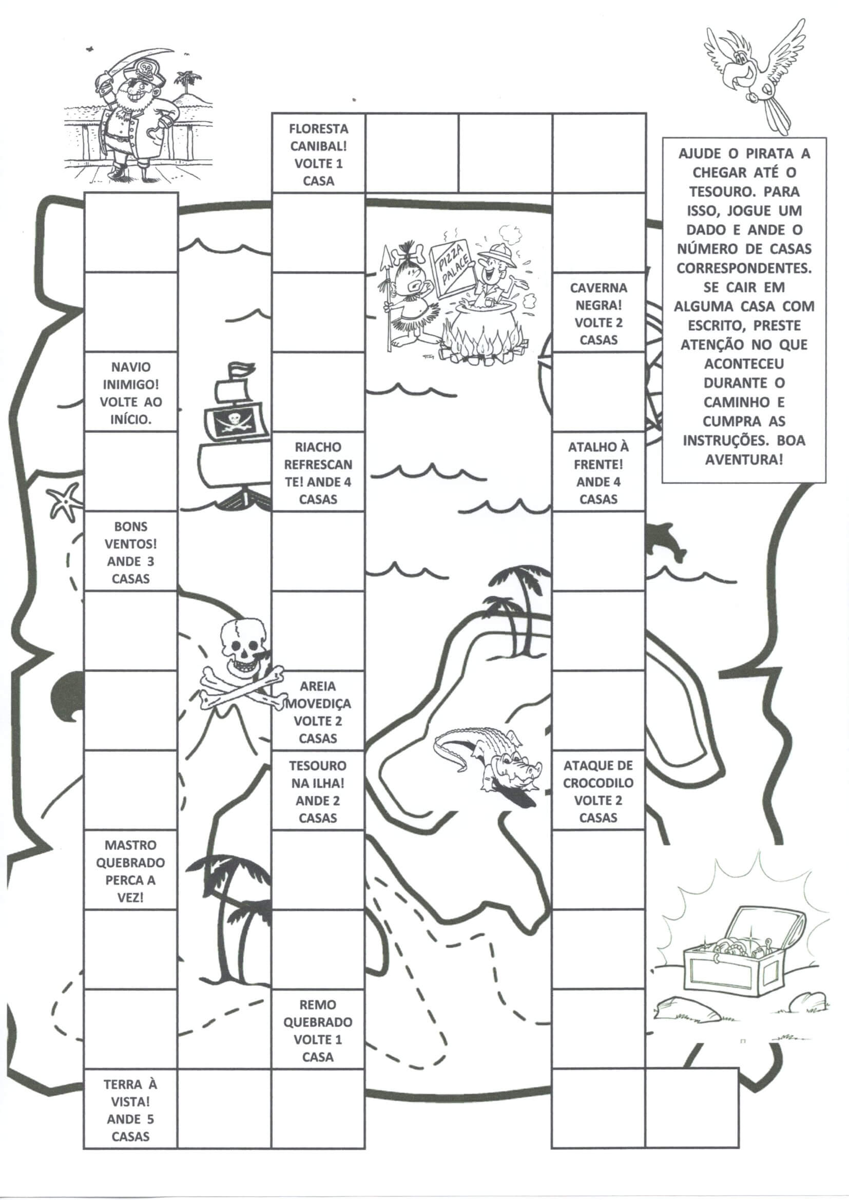 Jogo de Trilha-Caça ao Tesouro. Siga a Trilha para ajudar o pirata a encontrar o tesouro seguindo as instruções. Atividade de Ensino Fundamental pronta para imprimir e usar.