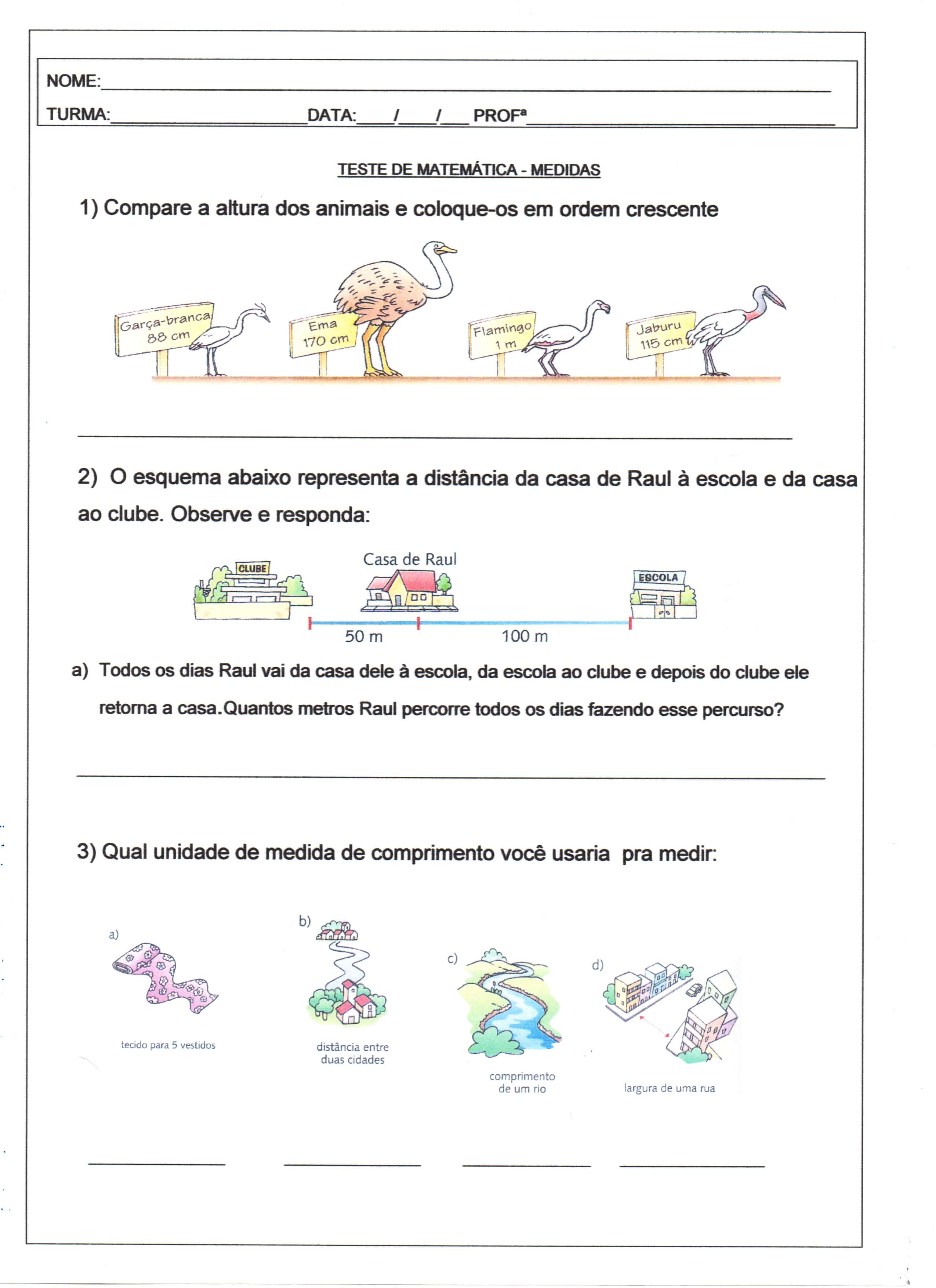 Teste de Matemática-Medidas-Parte 1. Atividade completa que permite fazer testes de conhecimento de medidas, comparação, ordem, distância, comprimento, altura, metros, centímetros e quilômetros.