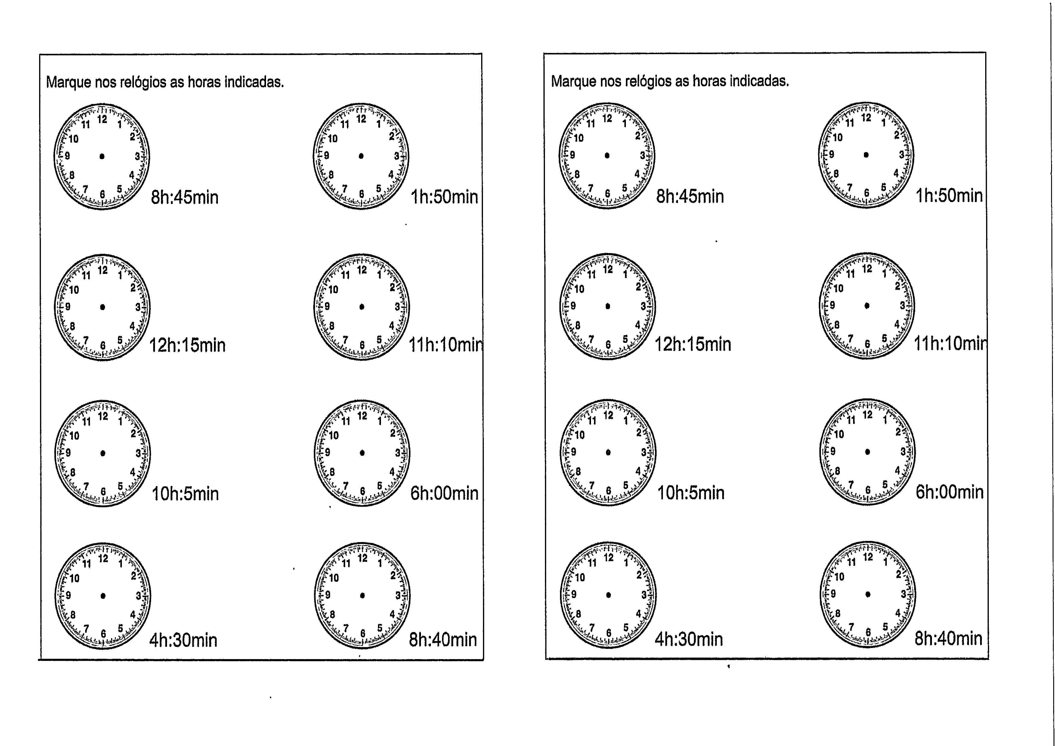 Atividade com Horas e Minutos-Relógio Analógico. Atividade para testar os conhecimentos das horas e minutos nos mostradores de relógios analógicos com exemplos digitais.