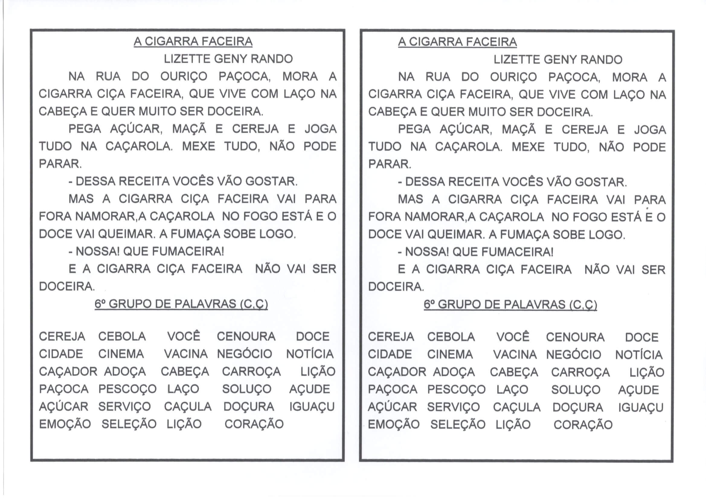 Letras C e Ç-Texto A Cigarra Faceira-Lista de palavras C e Ç. Excelente atividade que permite trabalhar uma lista de palavras com C e Ç, facilitando a diferenciação entre elas.