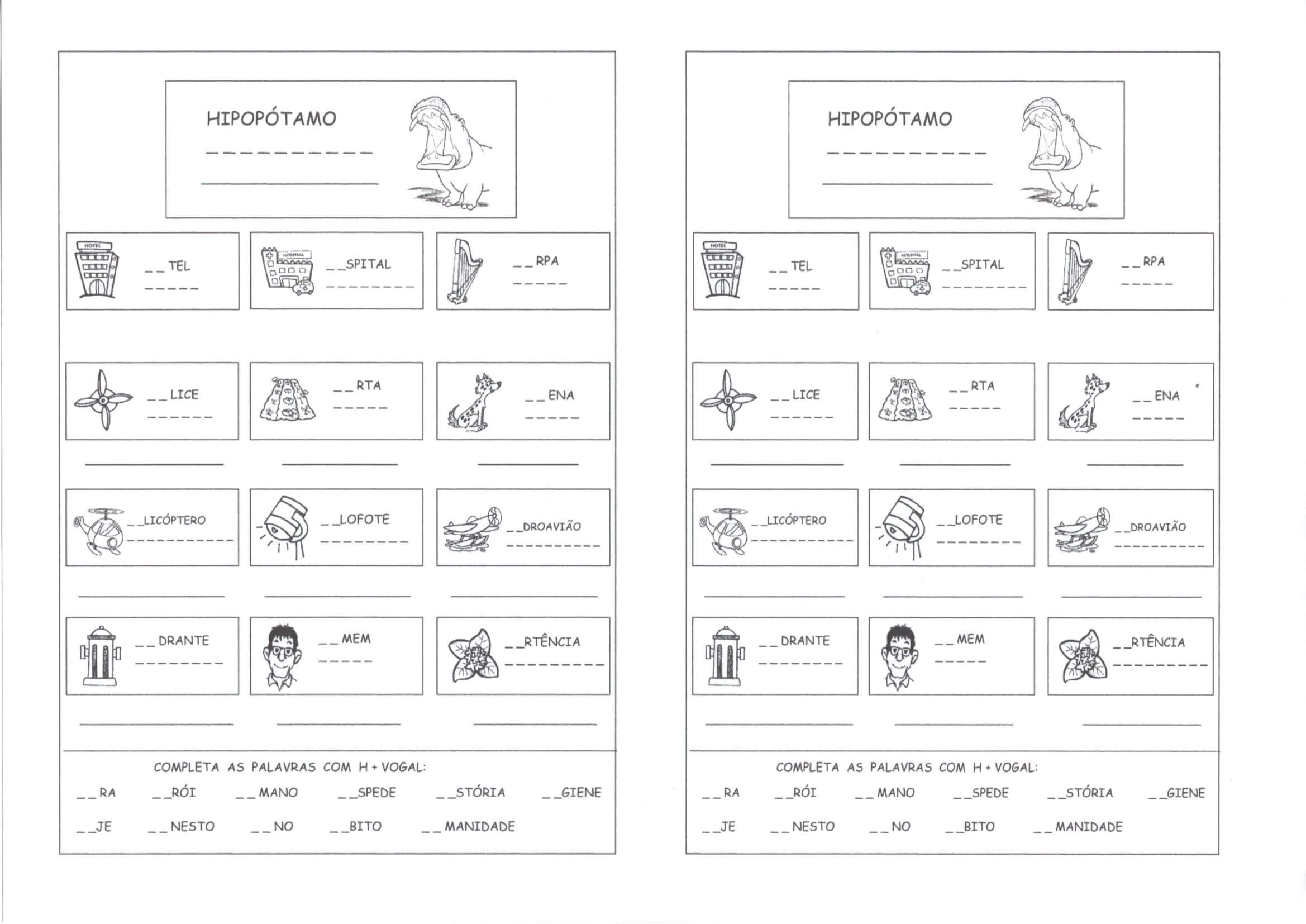 Letra H Inicial-Complete as frases. Atividade para escrever palavras com a Letra H inicial, a partir de um banco de palavras e de figuras.