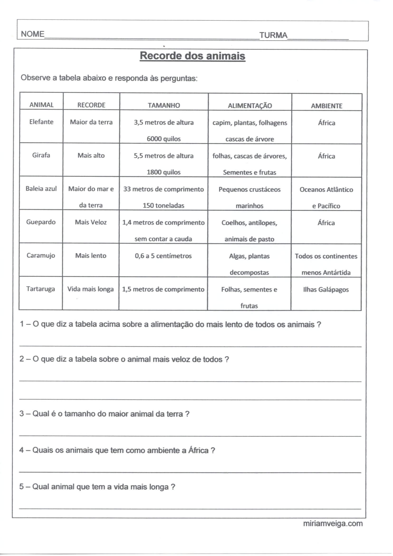 …Atividades com animais-Recorde dos Animais-Tabela. Esta atividade fornece a velocidade, tamanho, local de origem, alimentação de vários animais e faz questões relativas ao texto.