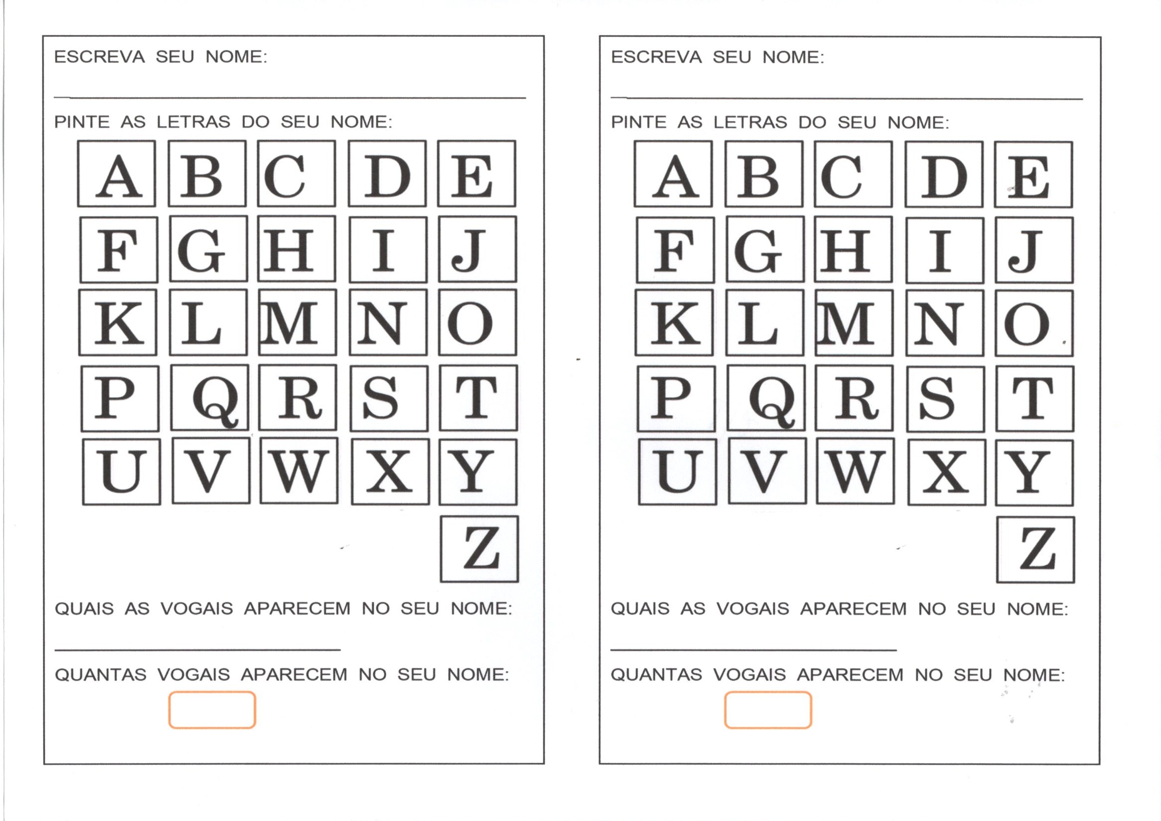 Avaliação com Alfabeto-Letra do nome. Esta Avaliação trabalha com Leitura, Alfabeto e Vogais, pronta para imprimir e usar.