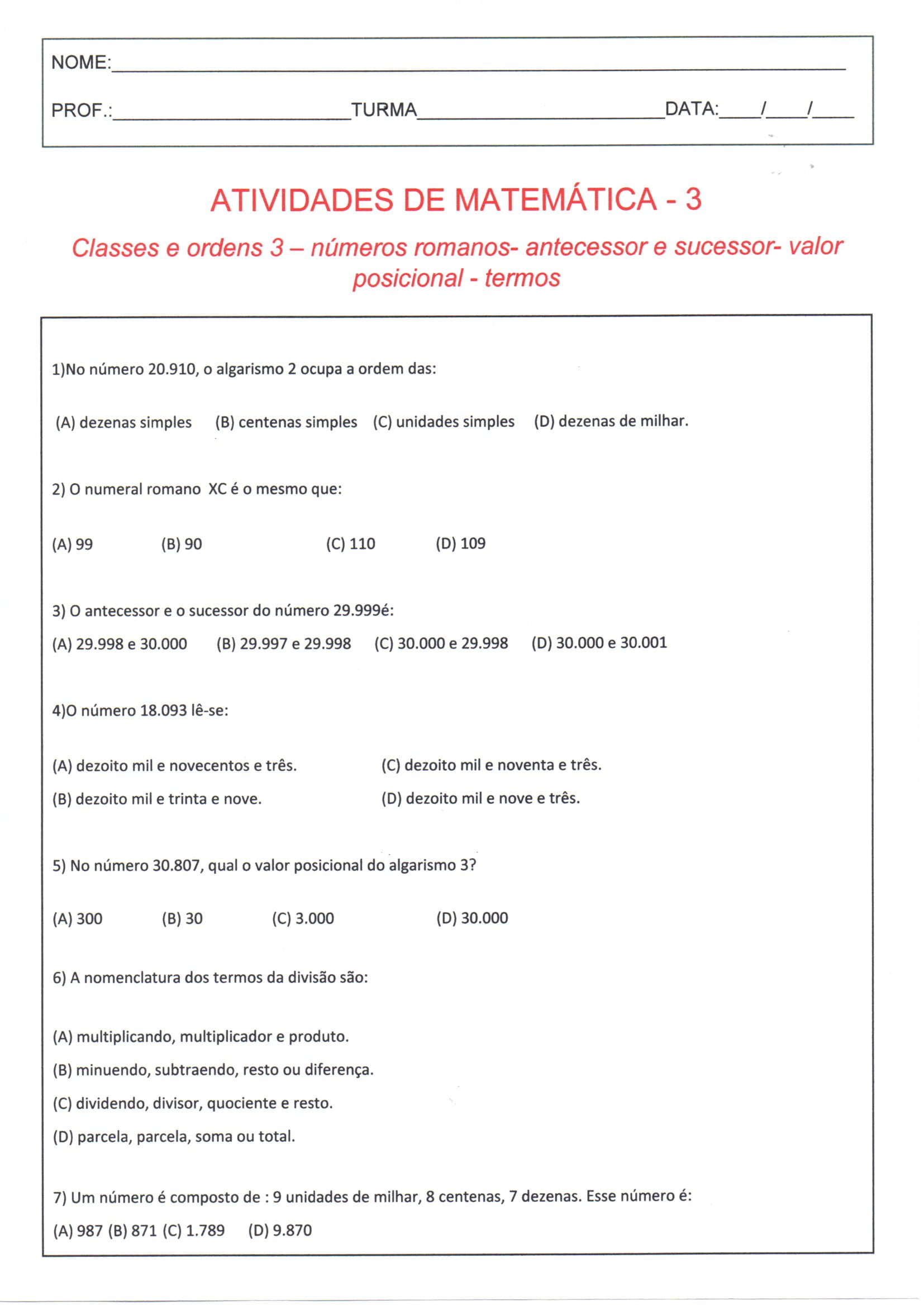 Classes e Ordens Números romanos é uma Atividade de Matemática que trabalha com classes e ordens, números romanos, antecessor e sucessor, valor posicional e termos.