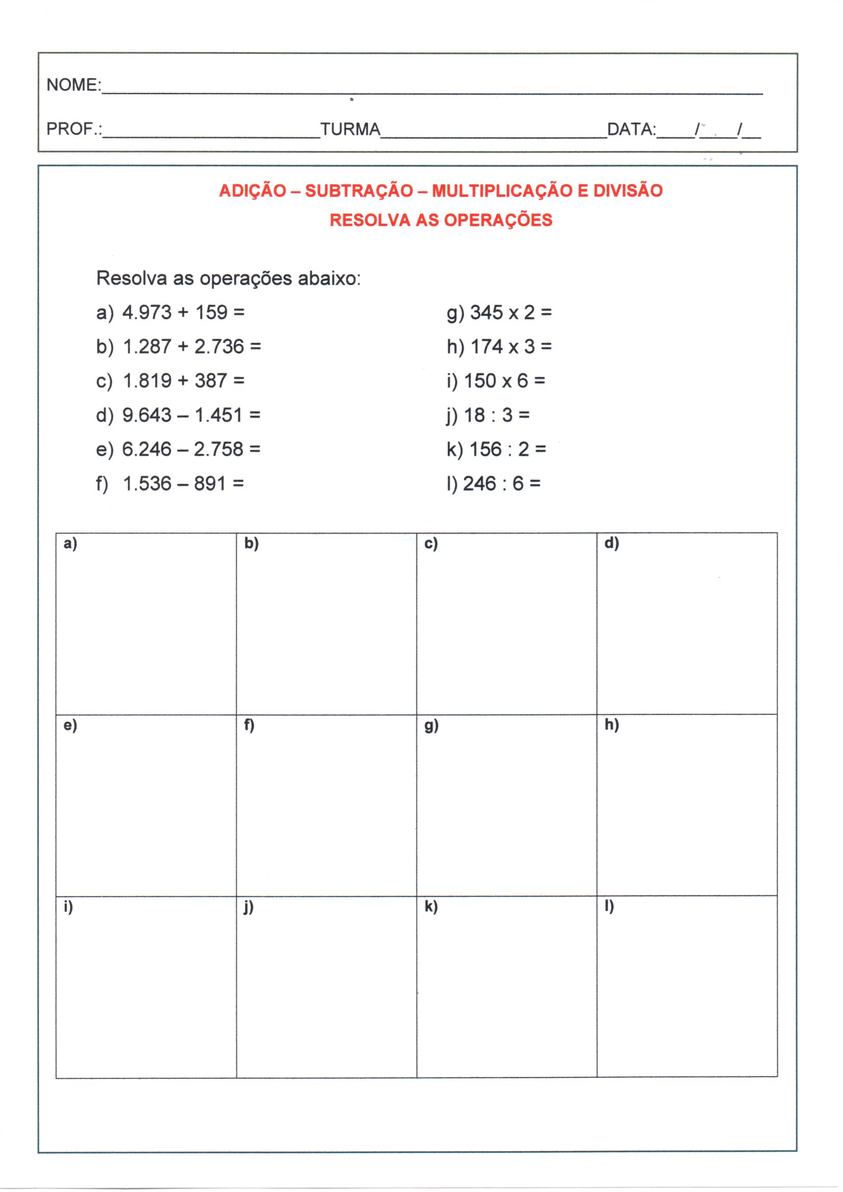 Esta é uma Atividade de Matemática com adição, subtração, multiplicação e divisão para armar e resolver.