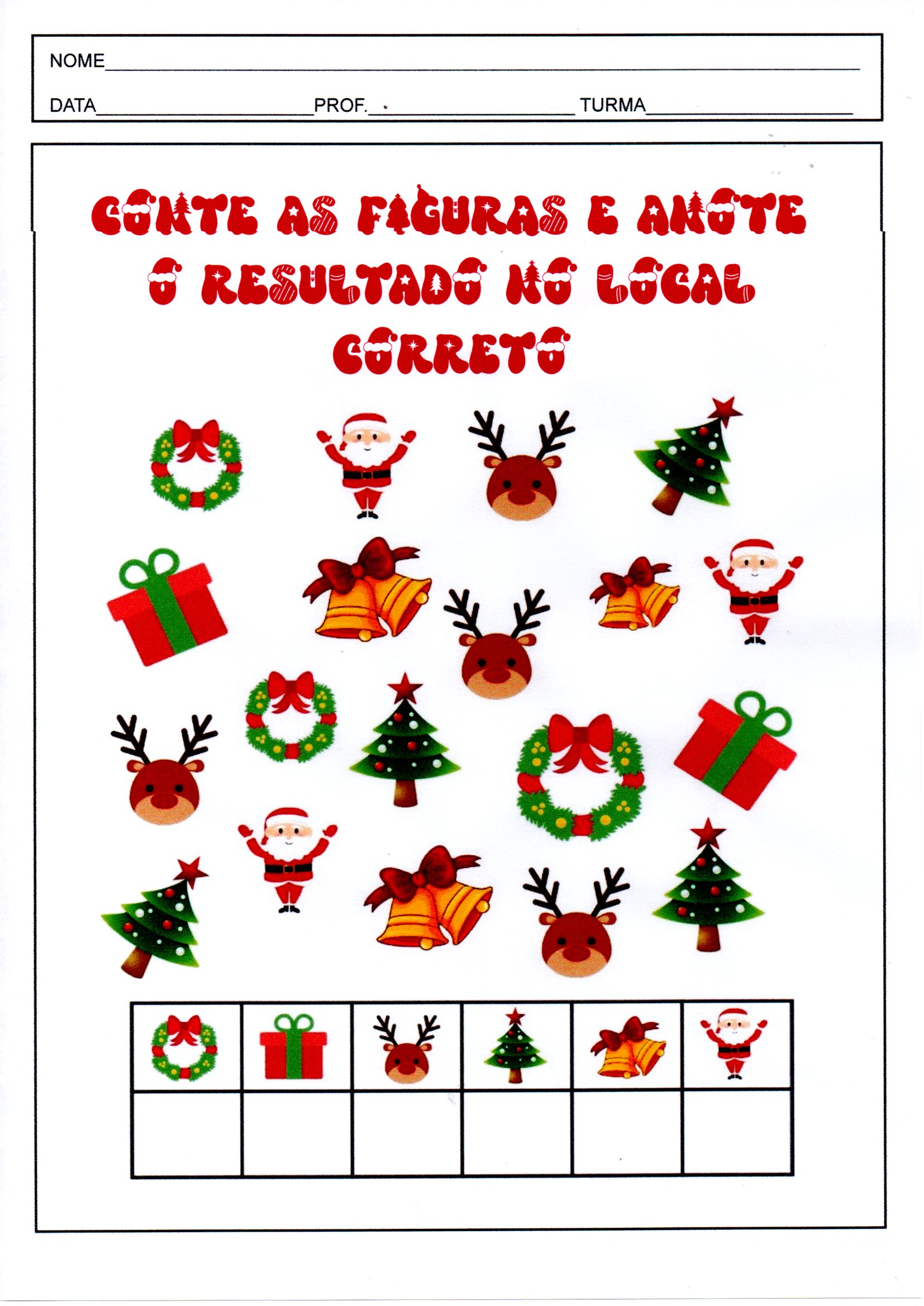 Conte as figuras e anote no local correto é uma Atividade de Matemática para contar as figuras e anotar o numeral correspondente no quadradinho.