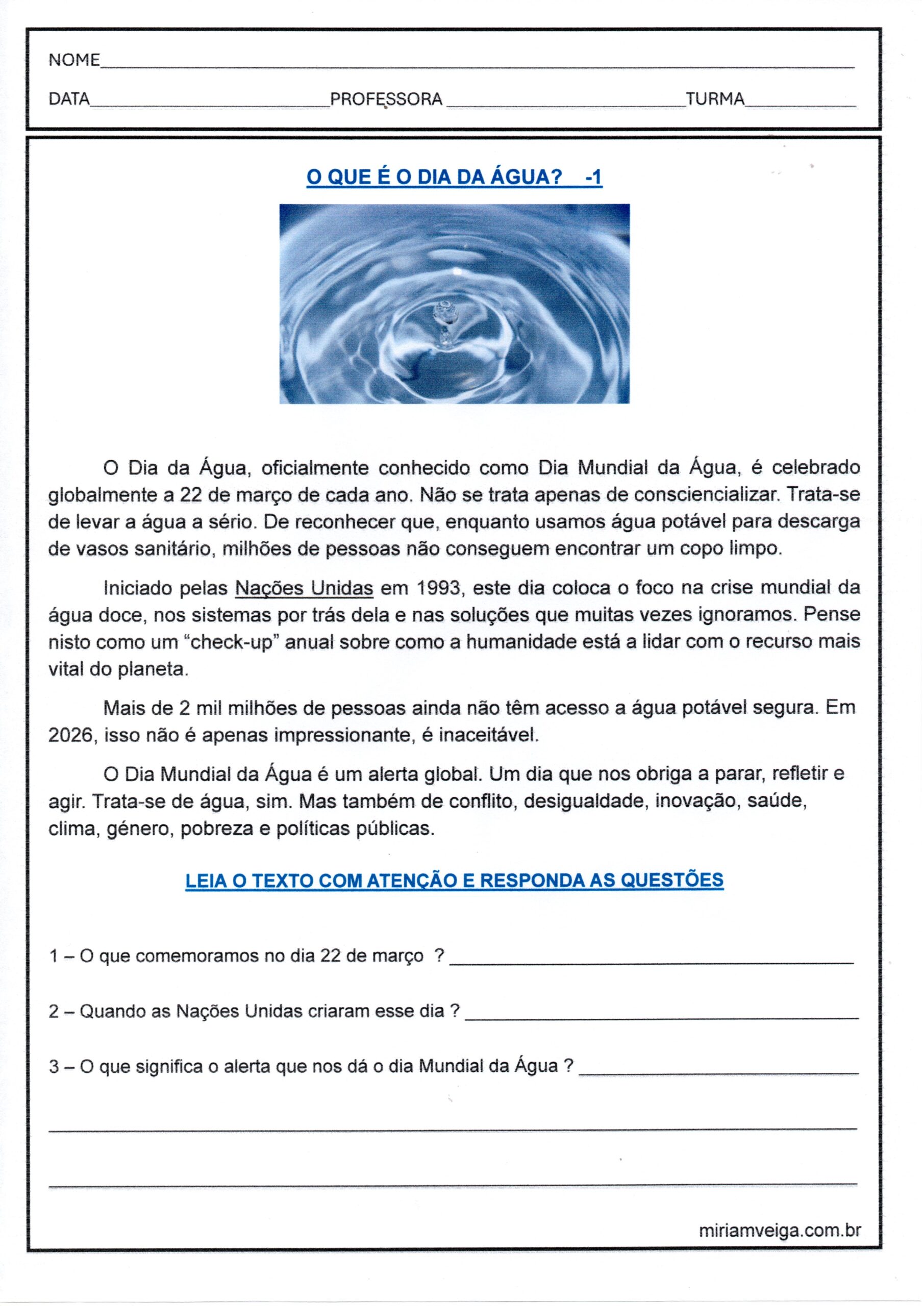 Dia Internacional da Água 1 é uma Atividade de Ciências com com Texto para Leitura e Interpretação, questões para resposta escrita e produção textual.