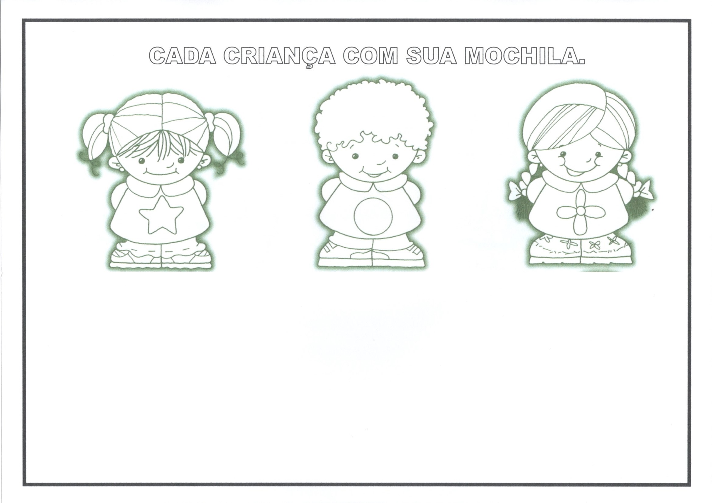 Atividade para recortar, encontrar, colar, completar e pintar as figuras dos animais e das crianças com suas mochilas.