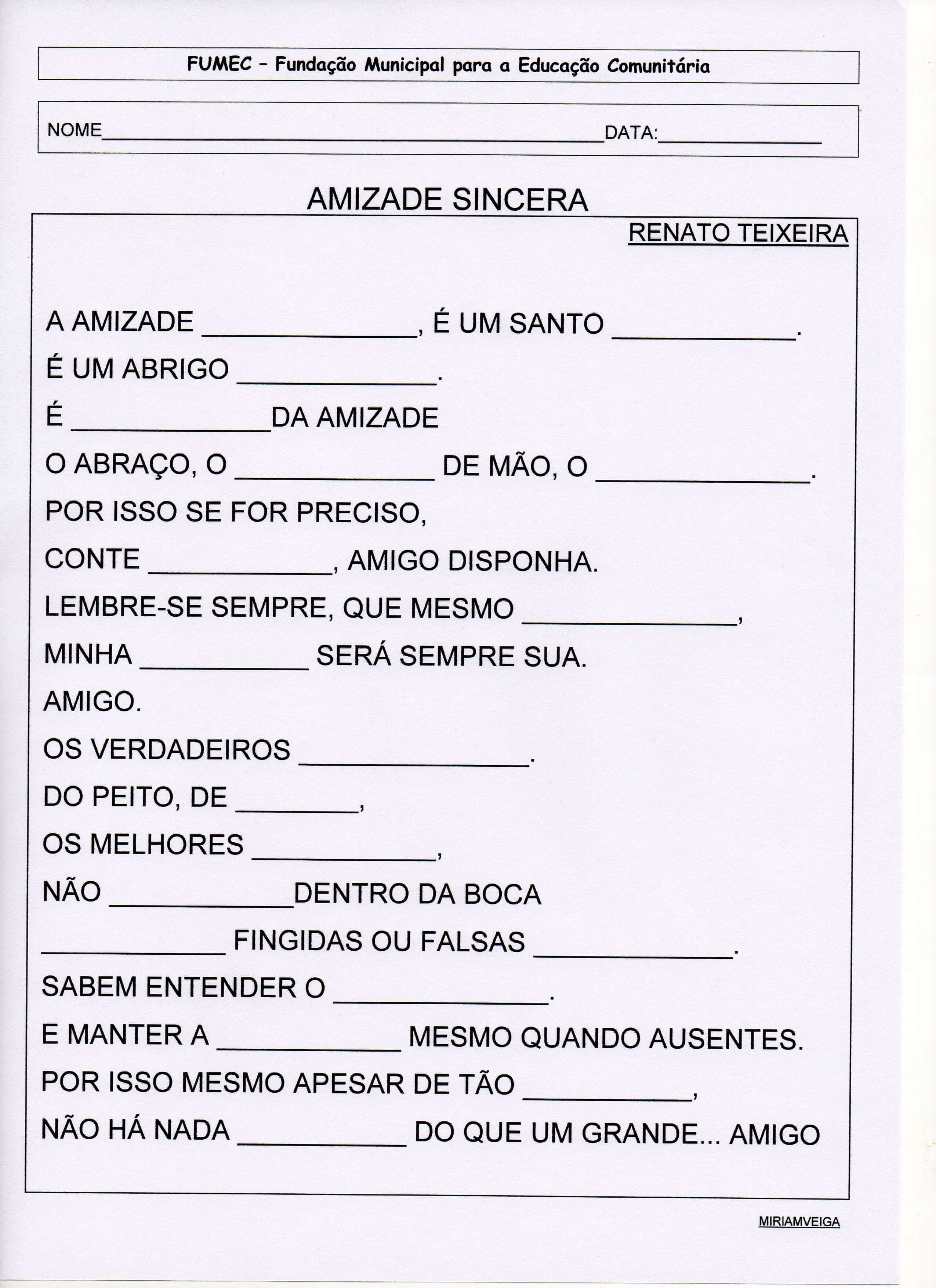Esta atividade com a letra da Música “Amizade Sincera”, de Renato Teixeira, forma um texto lacunado para ser preenchido corretamente.