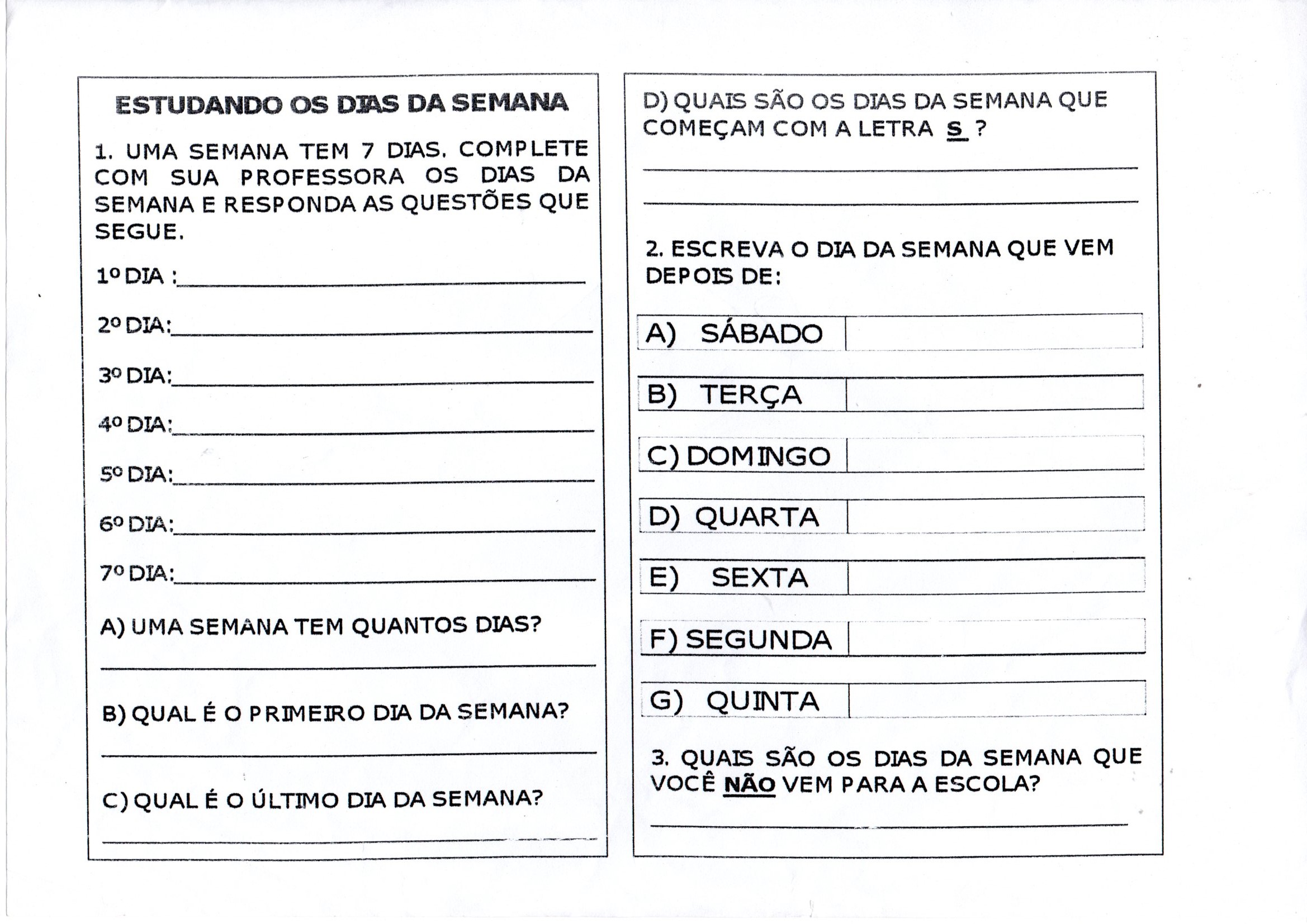 Estudando os dias da semana é uma Atividade com os dias da semana para escrever por extenso, antes e depois e ordem dos dias.