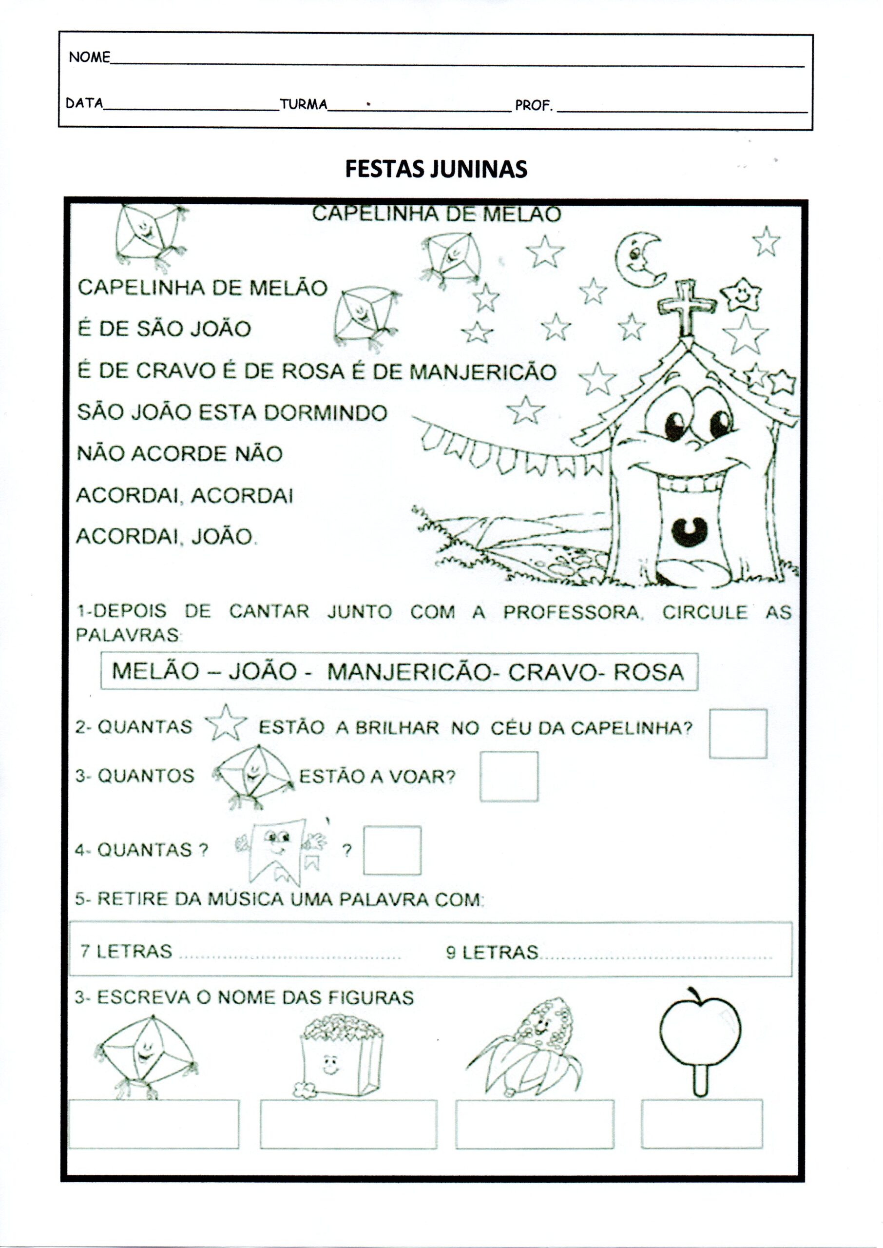 Festa Junina-Capelinha de Melão. Atividade Junina com a letra da música Capelinha de melão para ler e interpretar com perguntas de escrita e números.