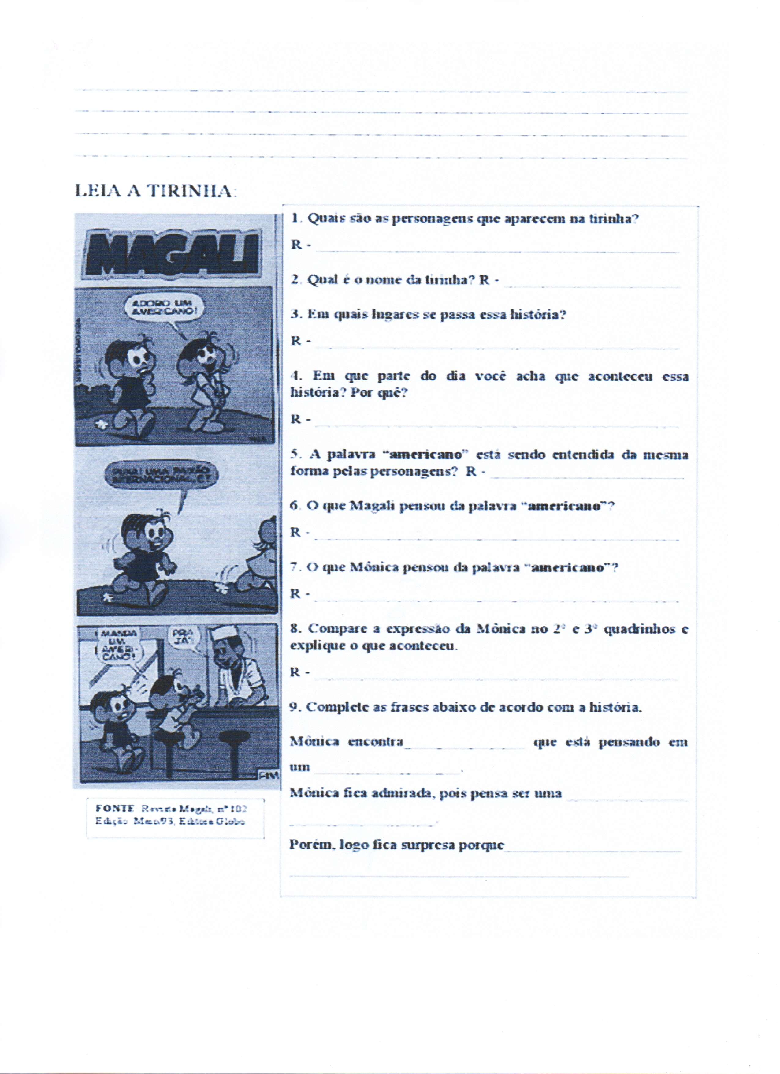 Interpretação de Tirinha-Magali. Através da tirinha é possível abordar compreensão, interpretação, distinção entre nomes e entendimento.