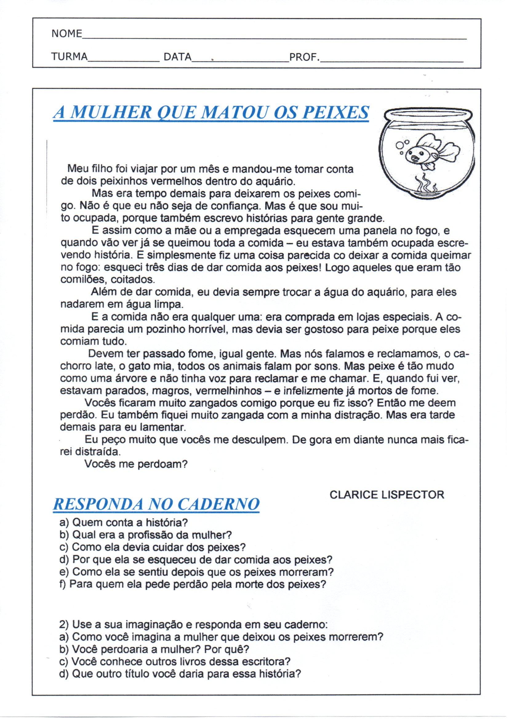 Leitura e interpretação A mulher que matou os peixes é uma Atividade de Língua Portuguesa para Leitura e Interpretação com o texto A mulher que matou os peixes, de Clarice Lispector e questões para responder no caderno.
