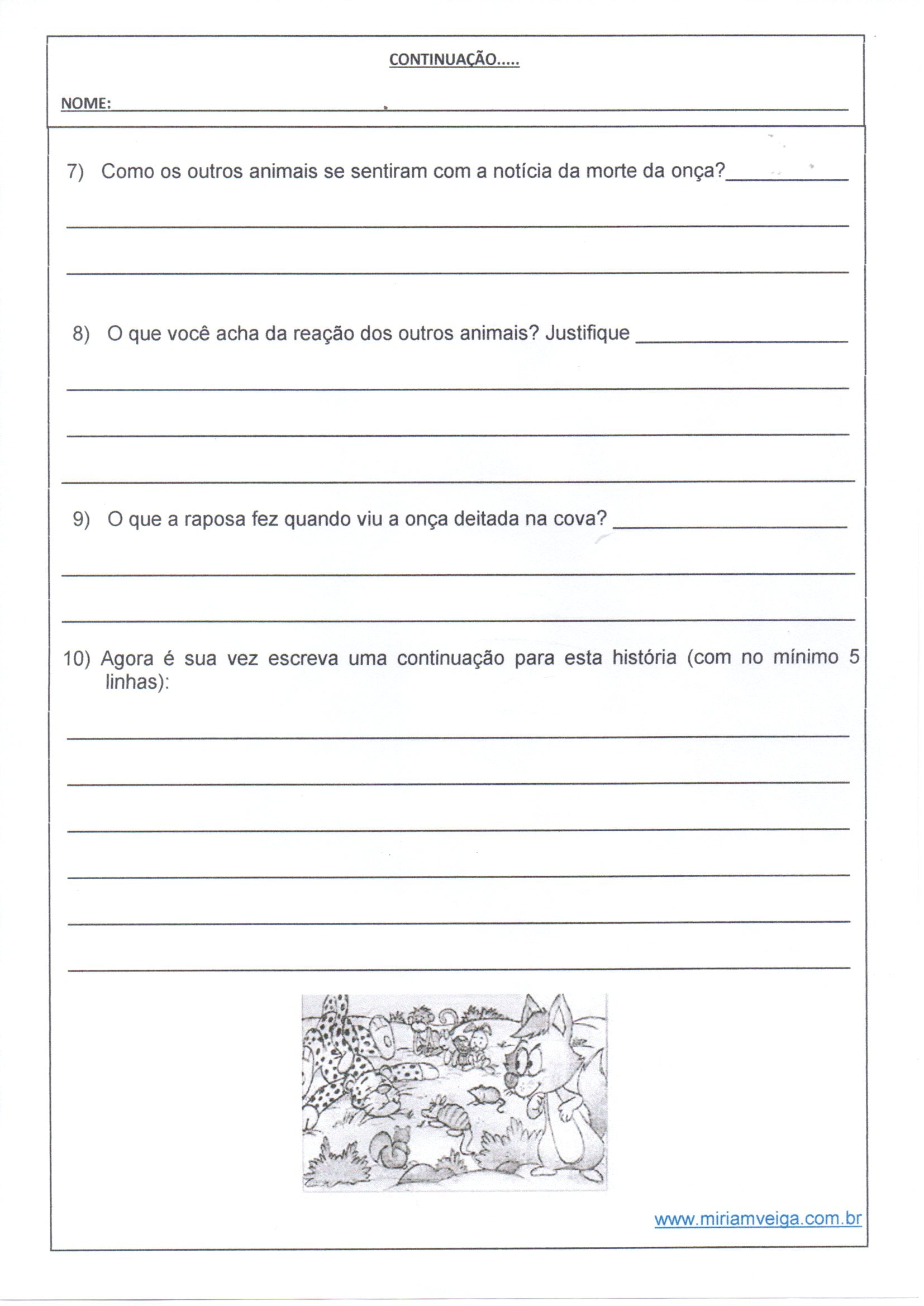 Leitura e interpretação A onça e a raposa 2 é uma Atividade de Língua Portuguesa para Leitura e Interpretação com um texto sobre A onça e a raposa e questões para responder na folha.