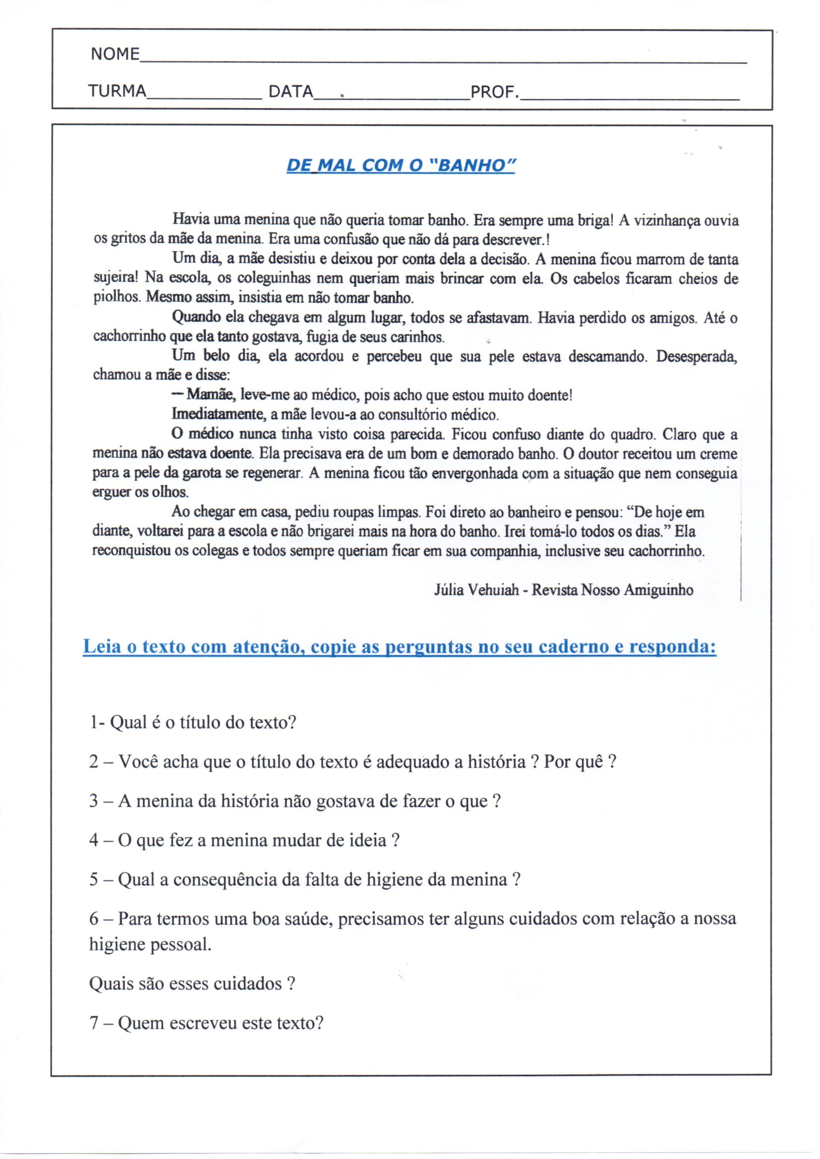 Leitura e interpretação De mal com o banho é uma Atividade de Língua Portuguesa para Leitura e Interpretação com o texto De mal com o banho com questões para responder no caderno.