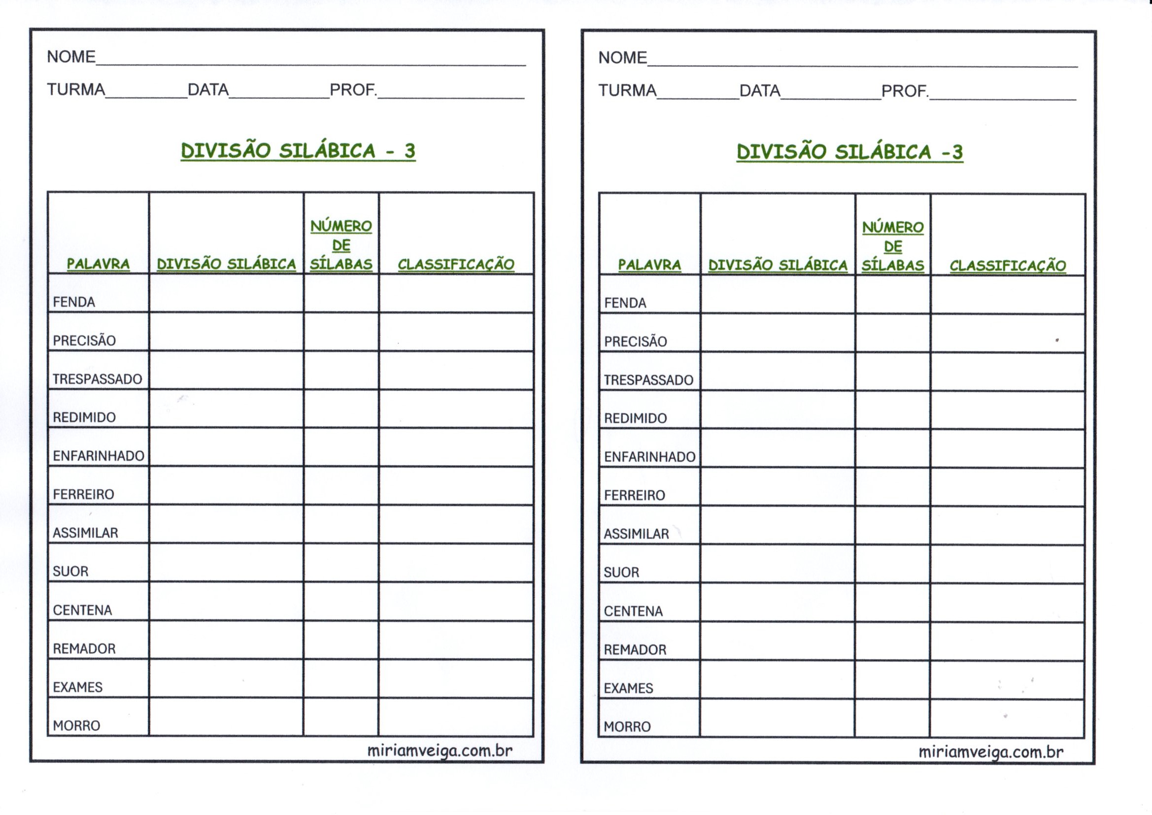 Língua Portuguesa-Divisão Silábica 3 é uma Atividade de Língua Portuguesa com divisão silábica, contagem de sílabas e classificação silábica das palavras da lista.
