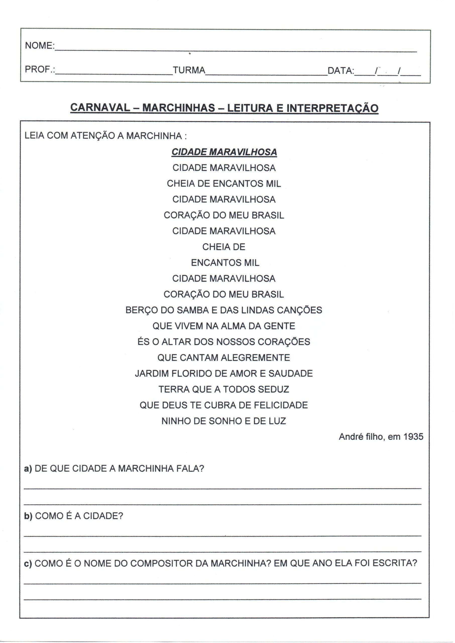 Marchinha de Carnaval-Leitura e interpretação 1 com Leitura e Interpretação e reescrita de frases da marchinha Cidade Maravilhosa.