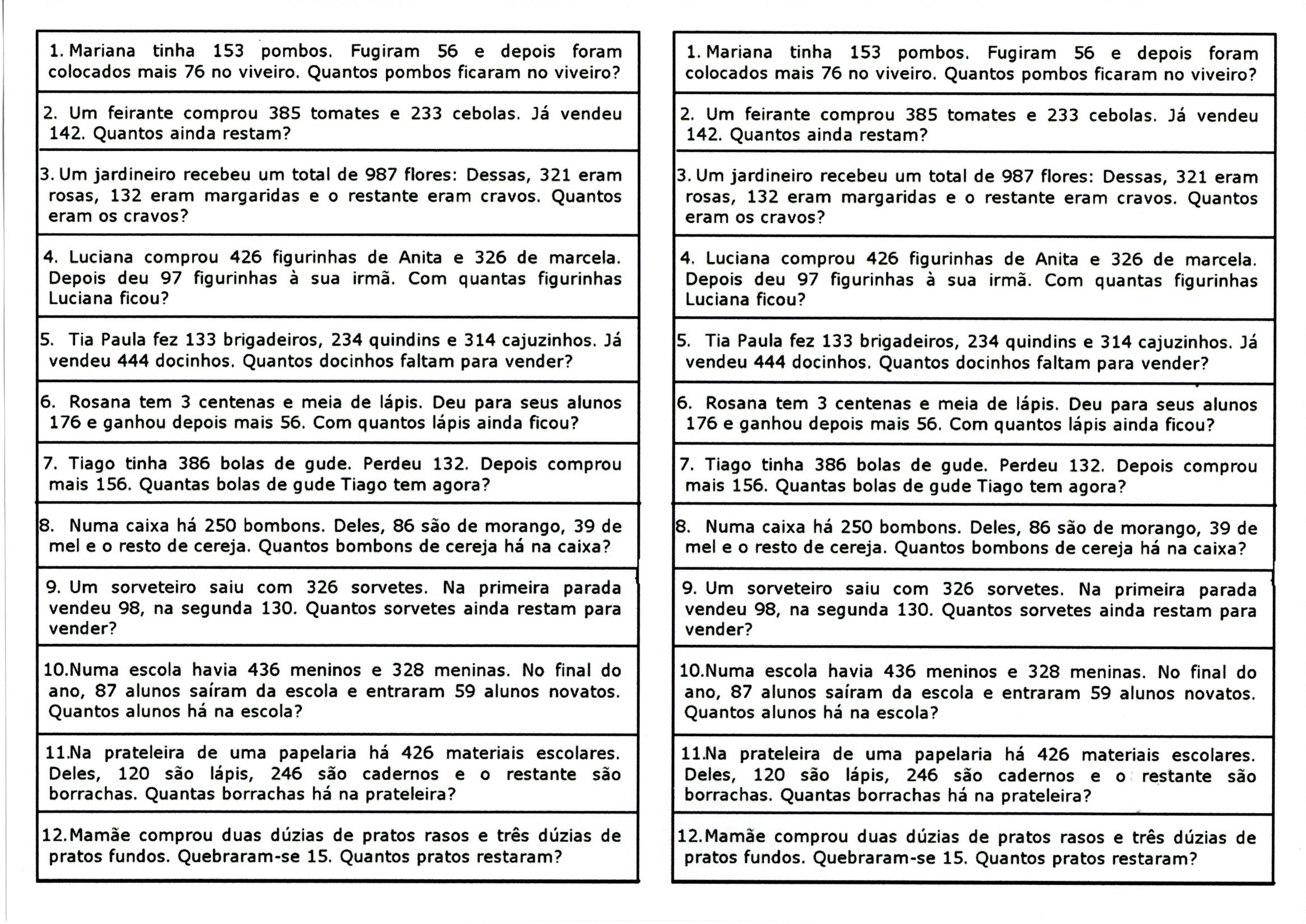 As tirinhas deverão ser recortadas e coladas no caderno para posterior montagem da conta no caderno e resolução.