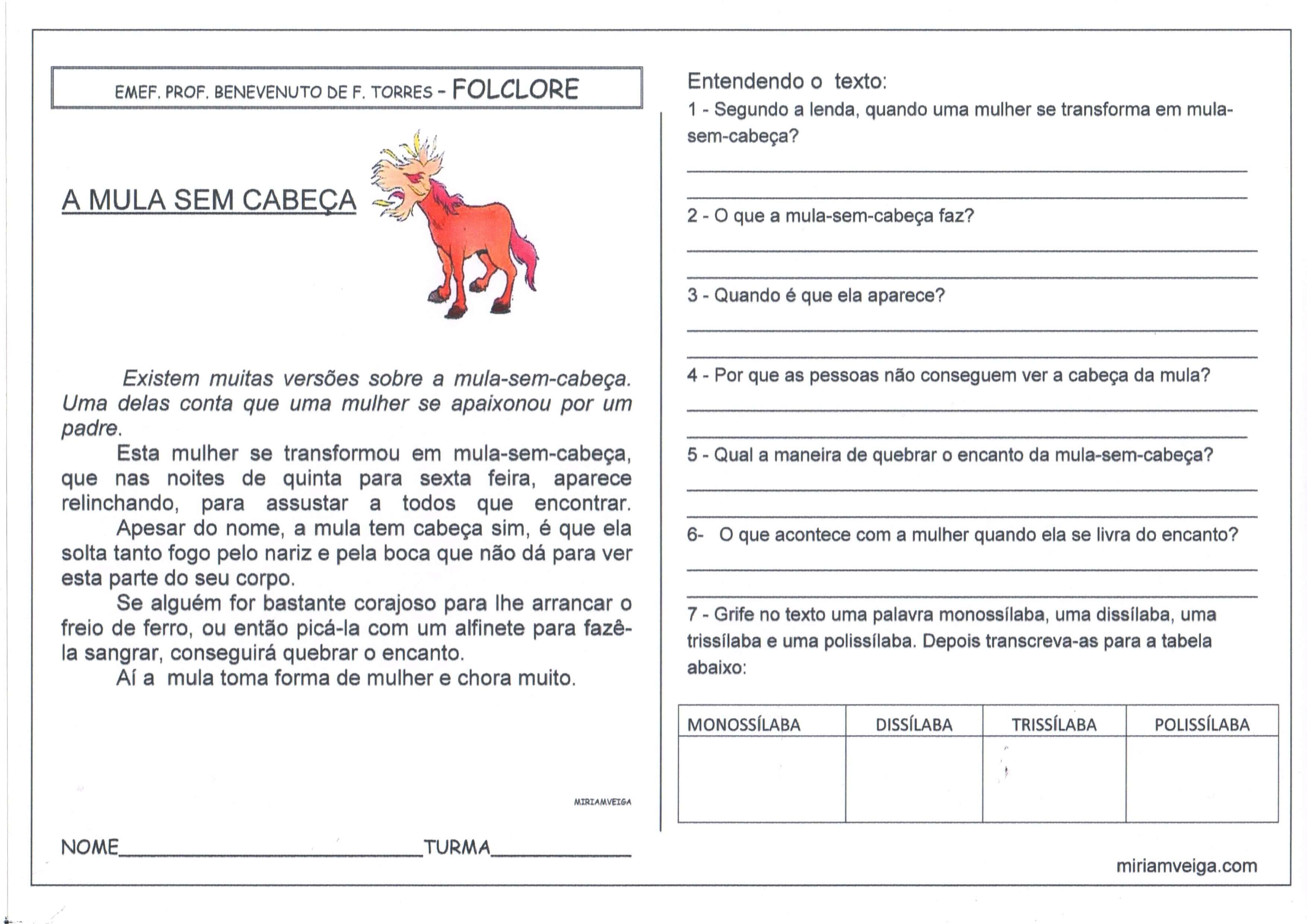 A Lenda da Mula sem cabeça 1 é uma Atividade de Lendas e Folclore com Leitura e interpretação e classificação silábica para Ensino Fundamental.