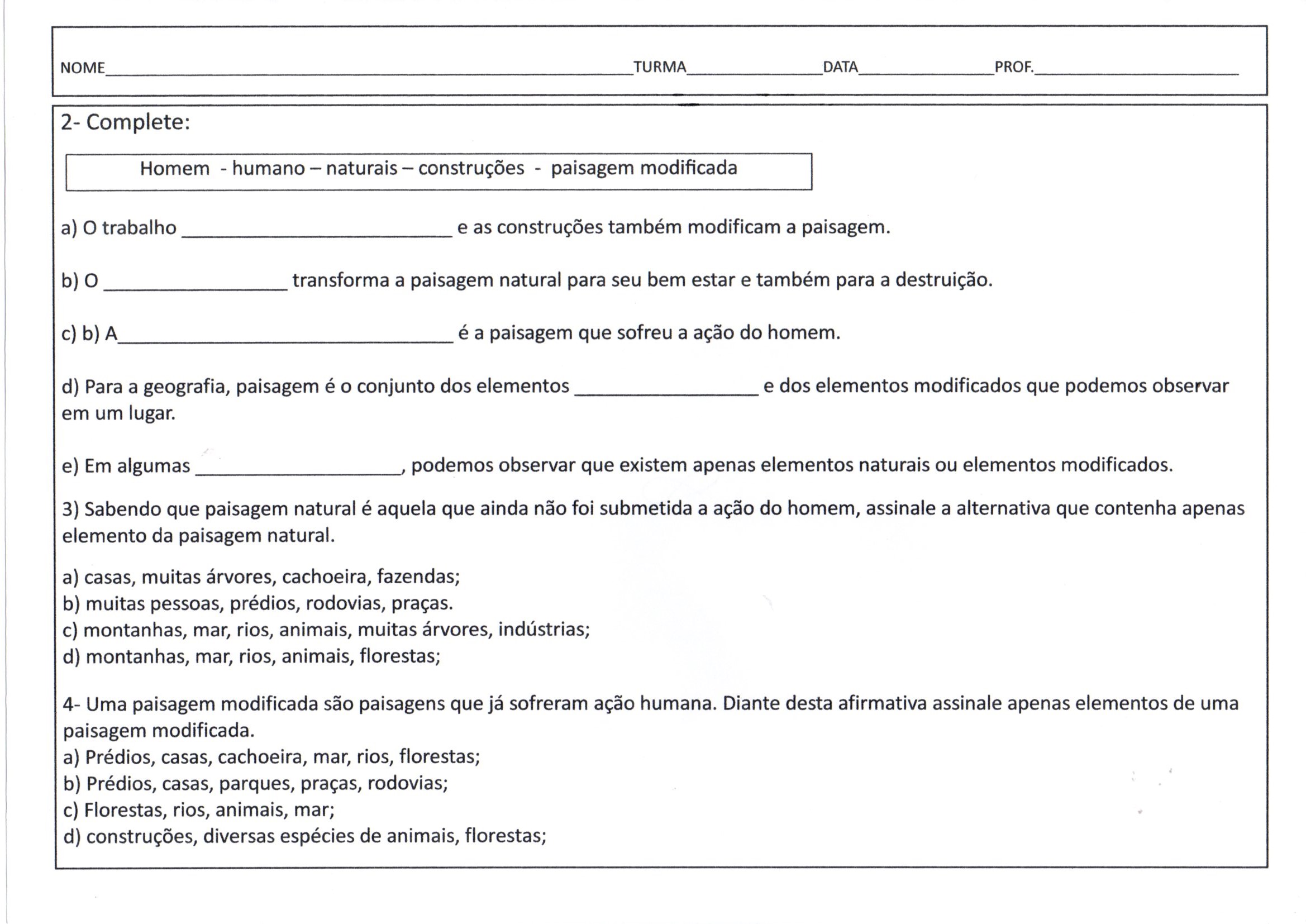 Paisagem natural e modificada 2-Questões é uma Atividade de Geografia com Caça palavras, Cruzadinhas, textos e imagens com questões e gabaritos.