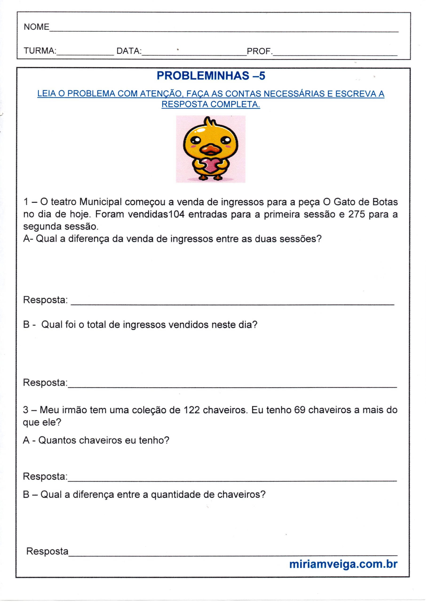 Probleminhas de matemática 5 é uma Atividade de Matemática com Probleminhas de Adição e Subtração para resolver e responder na folha.