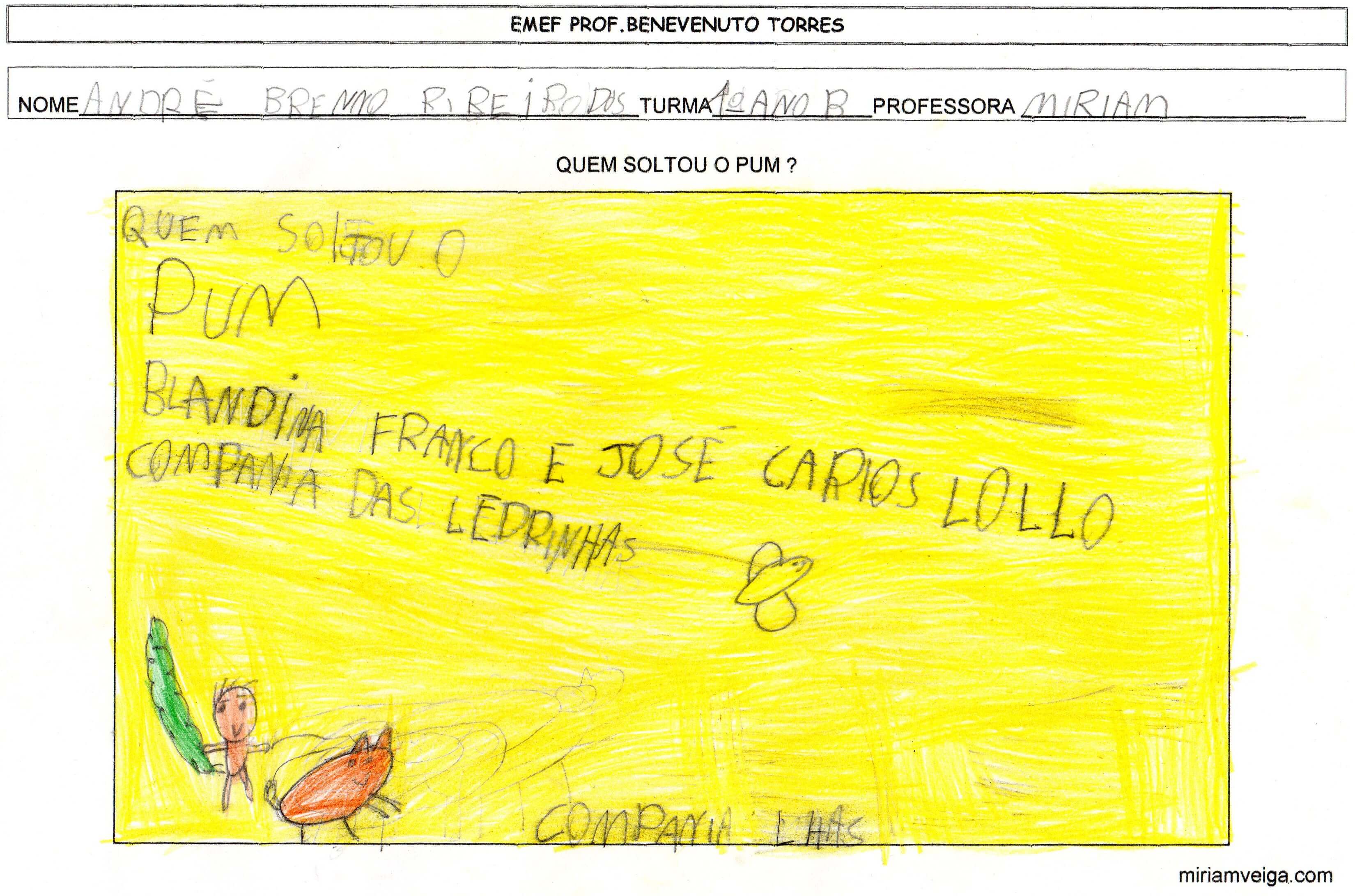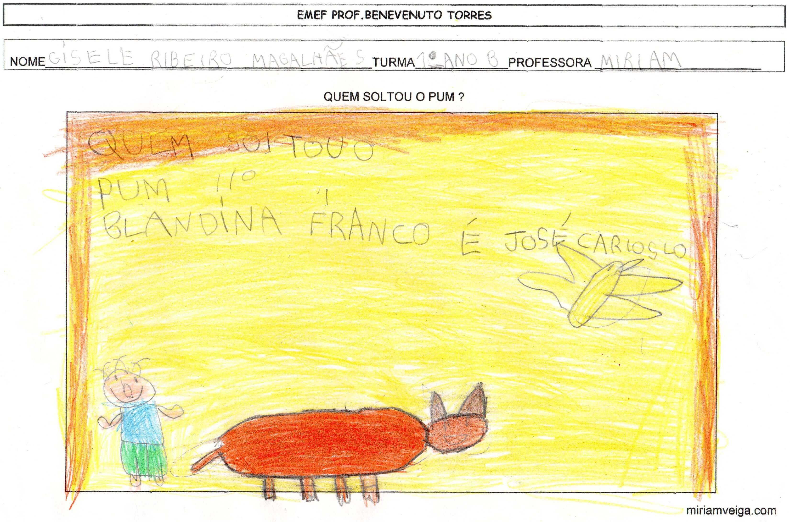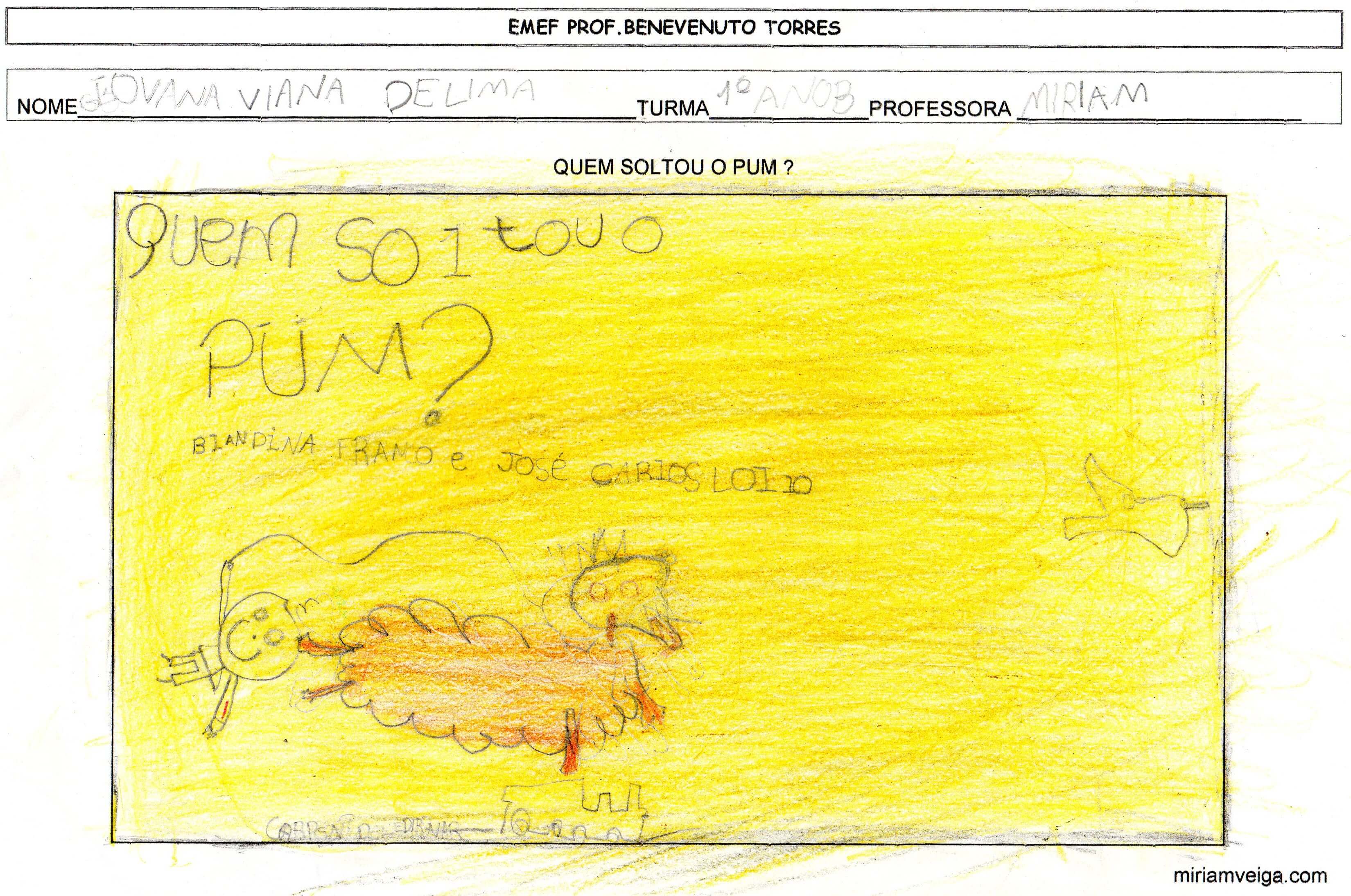 Quem soltou o Pum-Atividades dos alunos. Esta Atividade dos alunos mostra a reescrita com os desenhos da capa do livro “Quem soltou o Pum?”, de Blandina Franco e José Carlos Lollo, feitos pelos alunos. Alguns são de uma fidelidade impressionante, o que mostra o quanto esta atividade pode ser estimulante para as crianças.