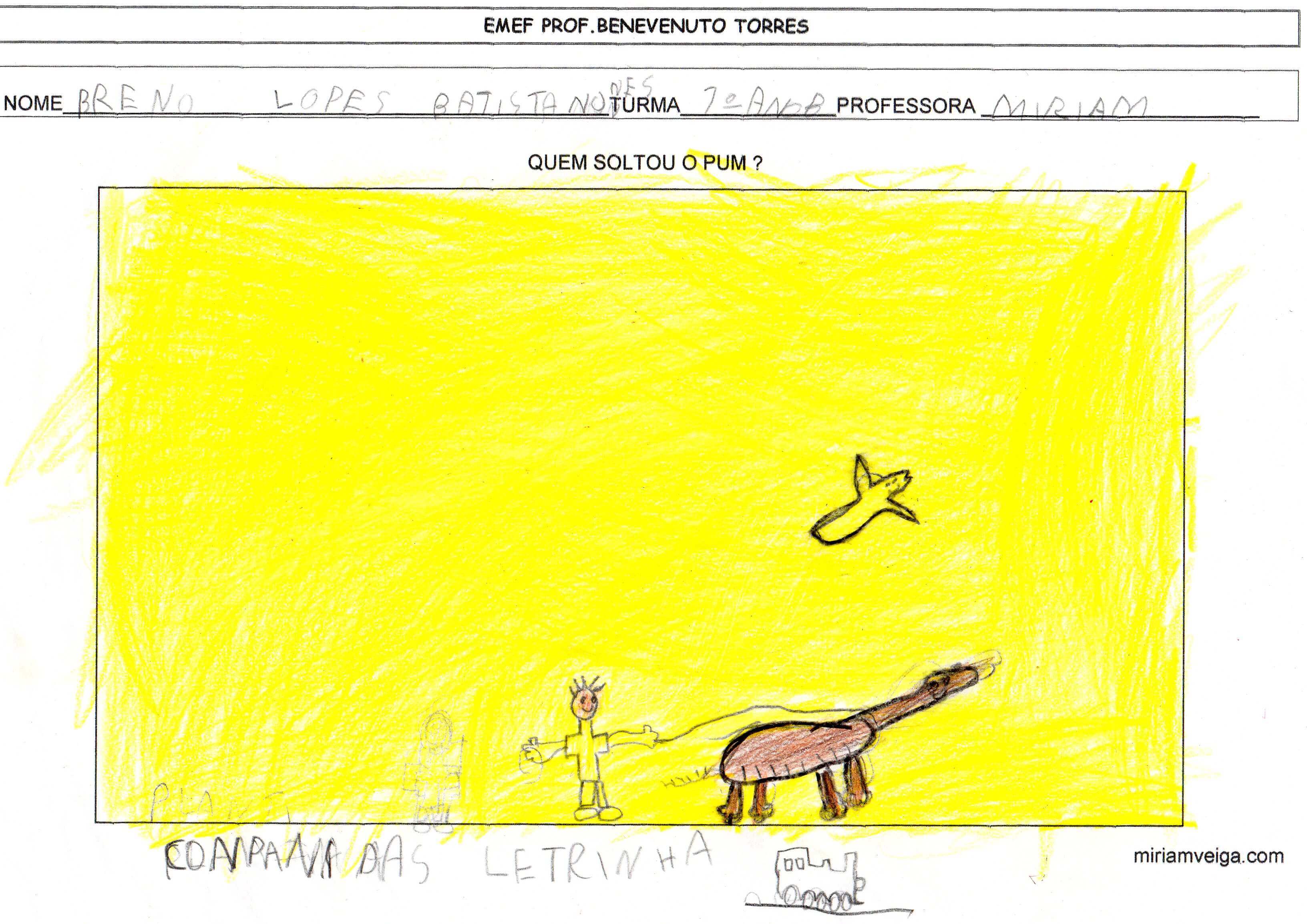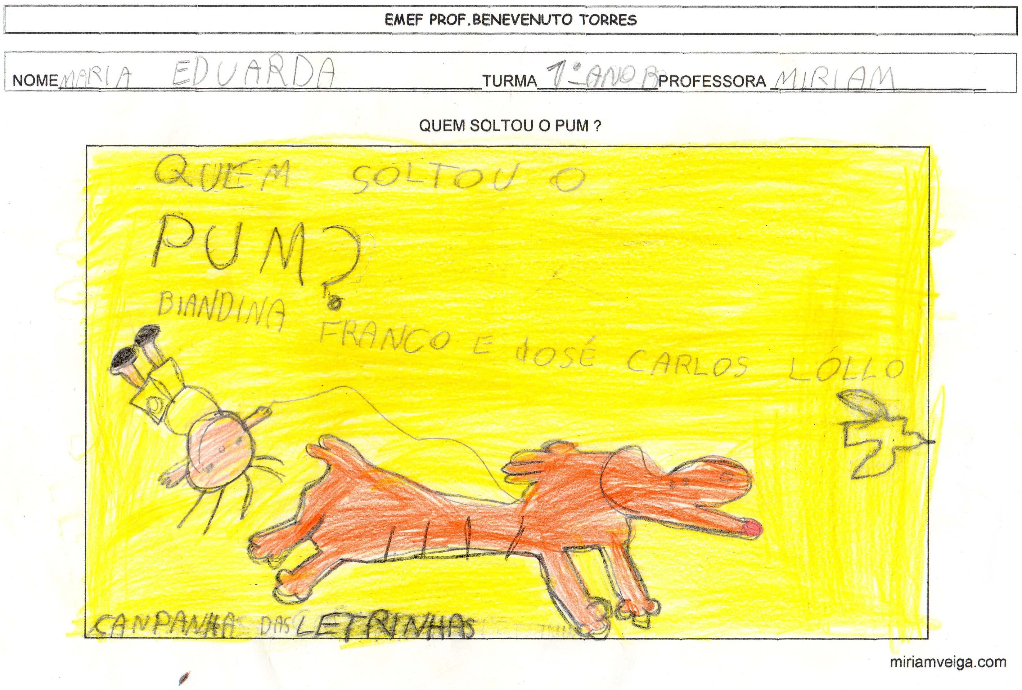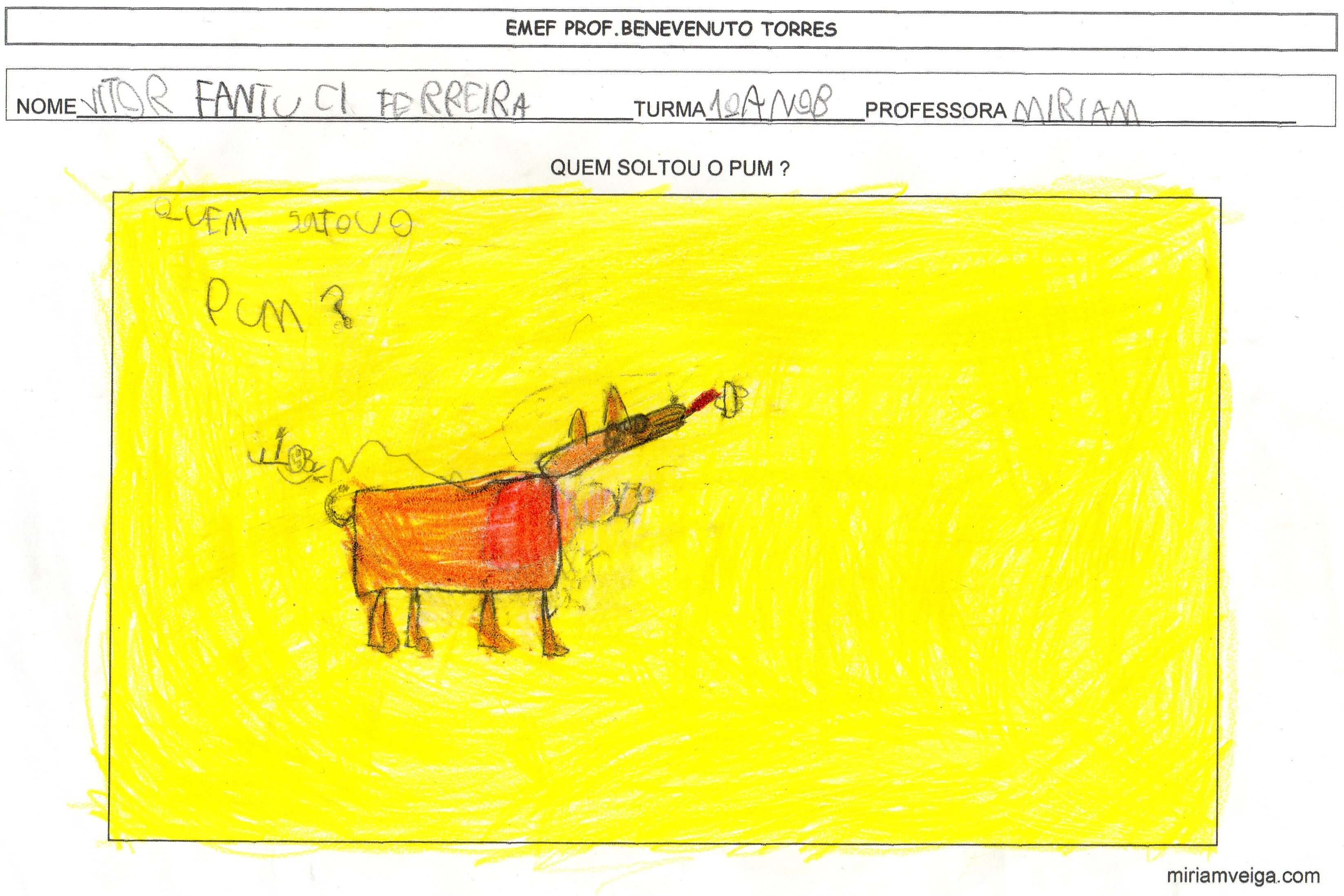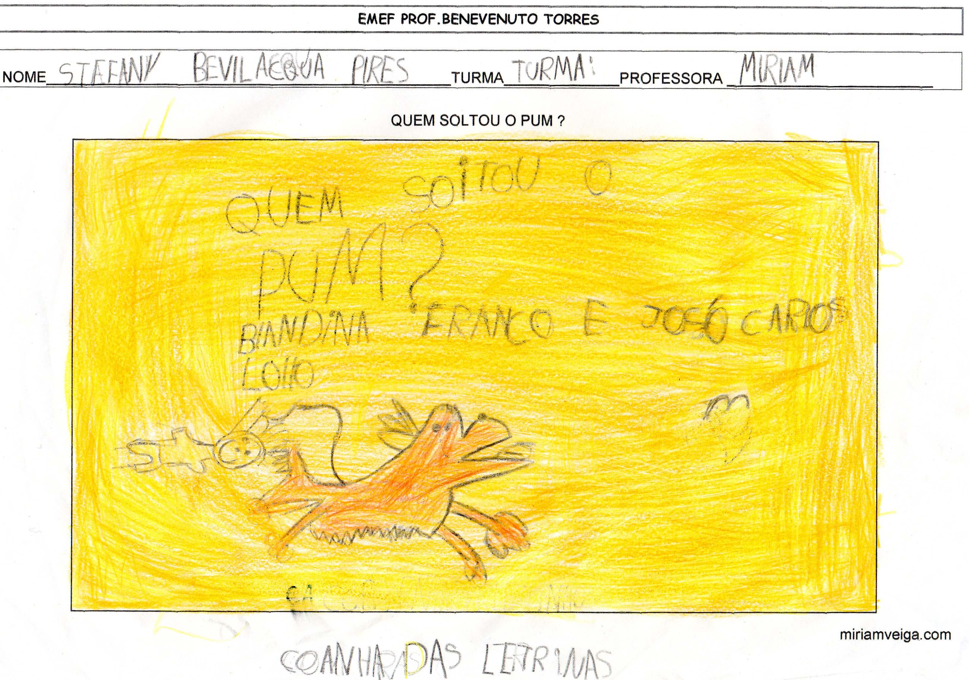 Quem soltou o Pum-Atividades dos alunos. Esta Atividade dos alunos mostra a reescrita com os desenhos da capa do livro “Quem soltou o Pum?”, de Blandina Franco e José Carlos Lollo, feitos pelos alunos. Alguns são de uma fidelidade impressionante, o que mostra o quanto esta atividade pode ser estimulante para as crianças.