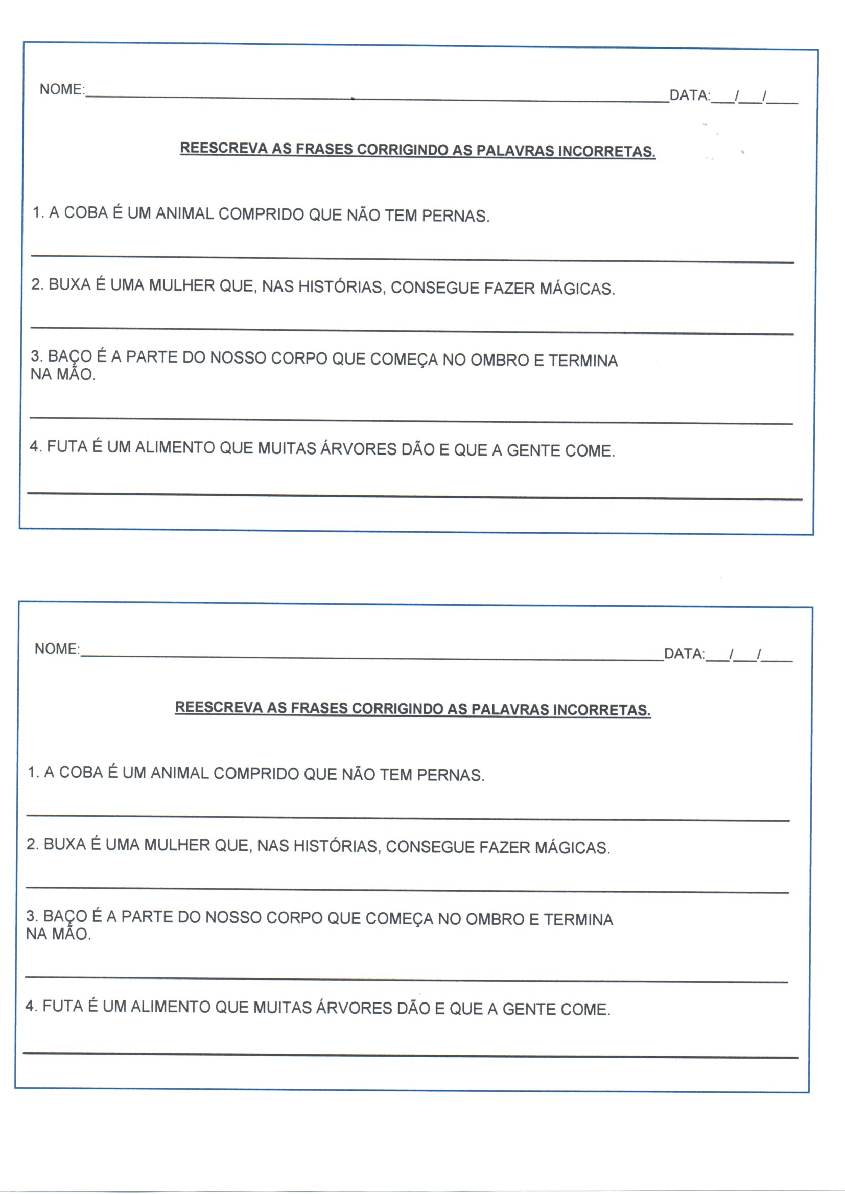 Os alunos poderão reescrever as frases no caderno substituindo os erros pelas palavras corretas.