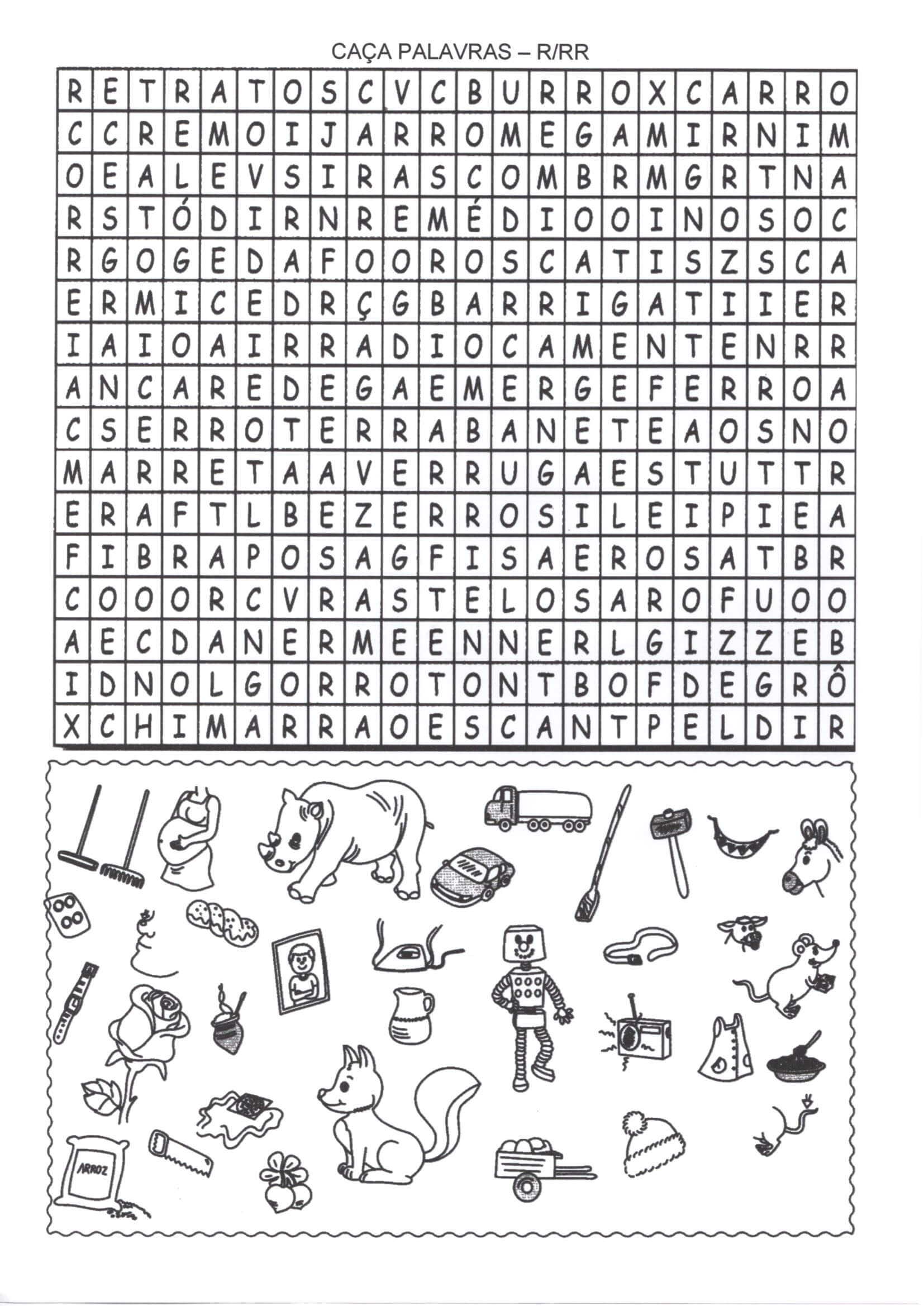 Esta atividade é um caça-palavras das letras R e RR com lista de palavras para escrever-Folha 1