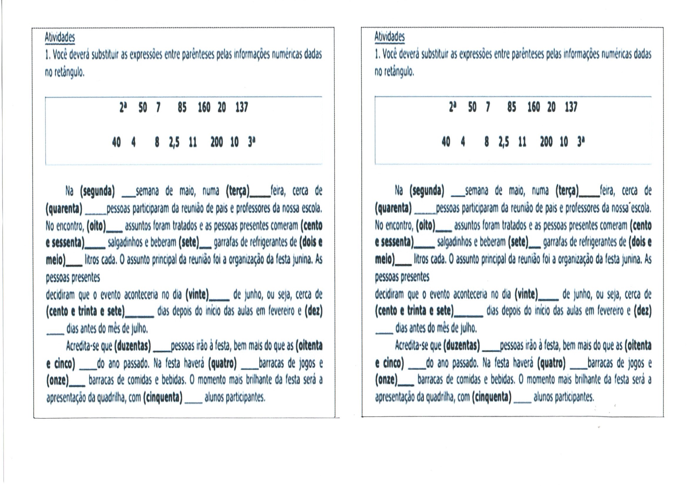 Numerais-Ordinais e Naturais para completar é uma Atividade de Matemática que vem com um texto para completar, onde o aluno deverá escrever por extenso o valor de cada número.
