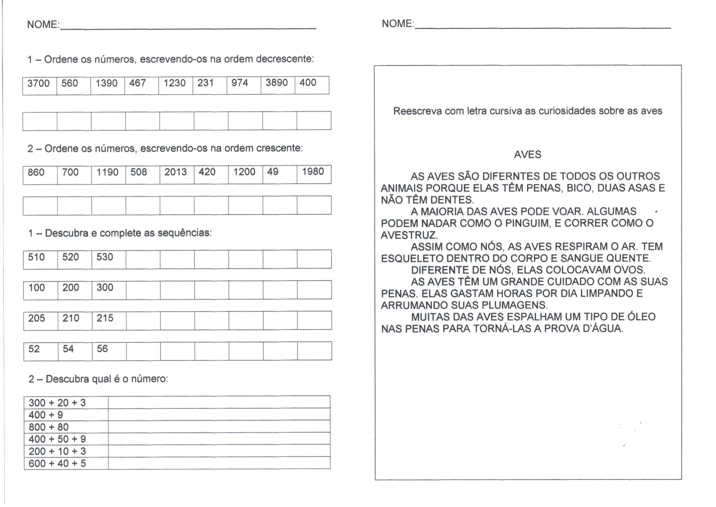 Numerais-Números naturais-Crescente e Decrescente é uma Atividade de Matemática e de Língua Portuguesa para ordenar os números e copiar o texto com letra cursiva.