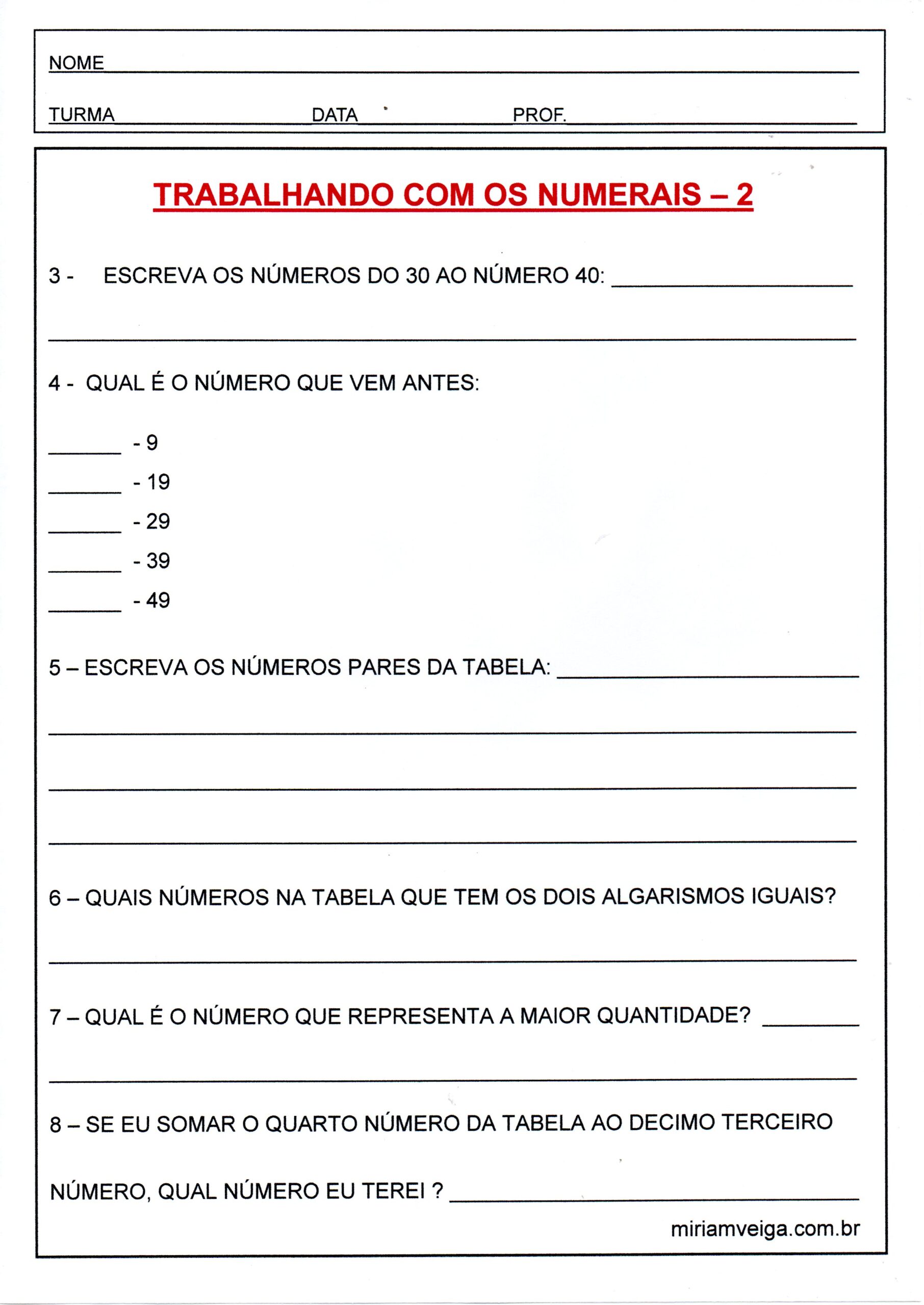 Trabalhando com os numerais 2 é uma Atividade de Matemática com tabela, maior, menor, numeral por extenso e continhas.