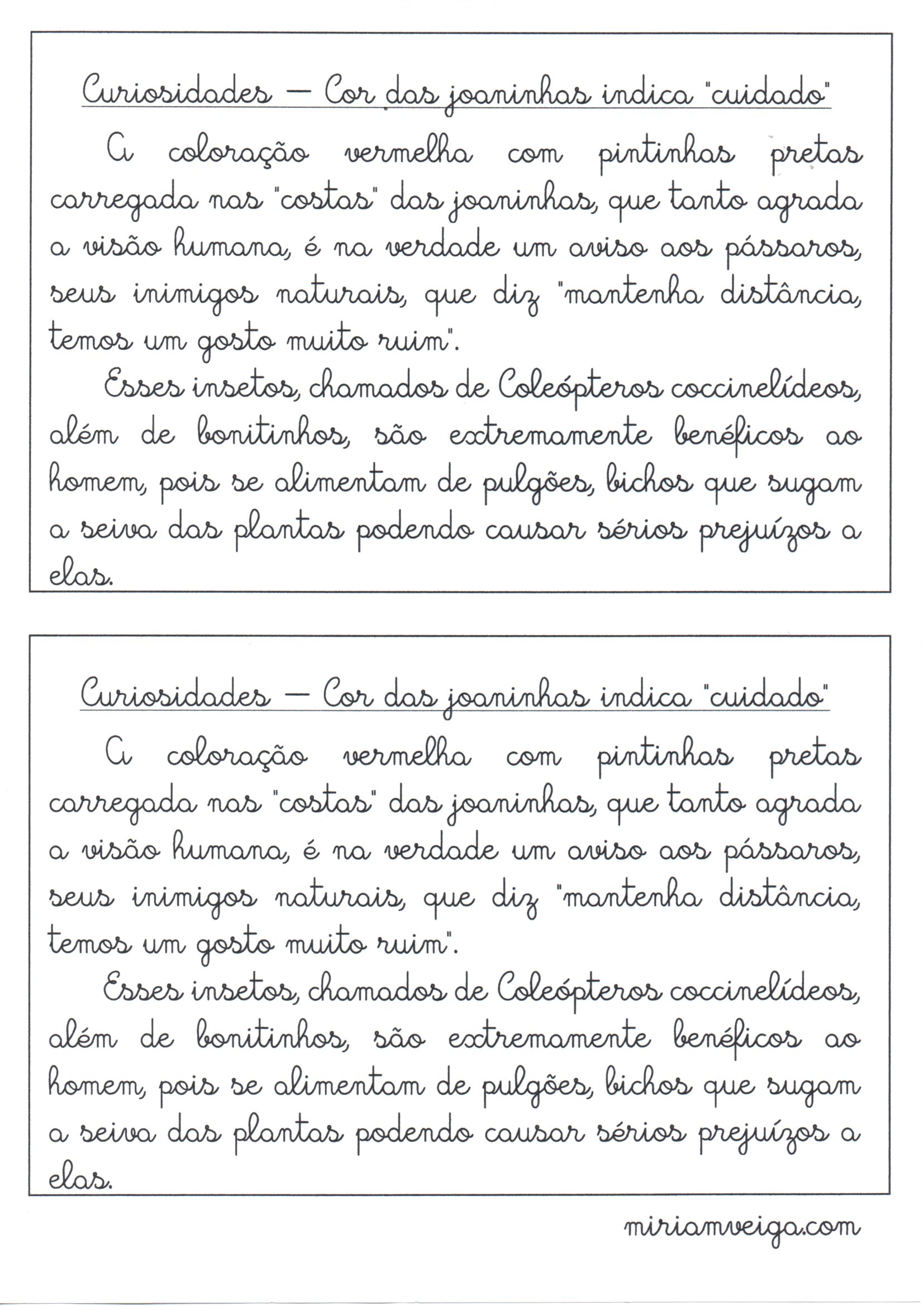 Treino de Letra Cursiva-Cor da Joaninha é uma Atividade de Língua Portuguesa para copiar e treinar a escriva de letra cursiva com um texto que fala do significado da cor da Joaninha.