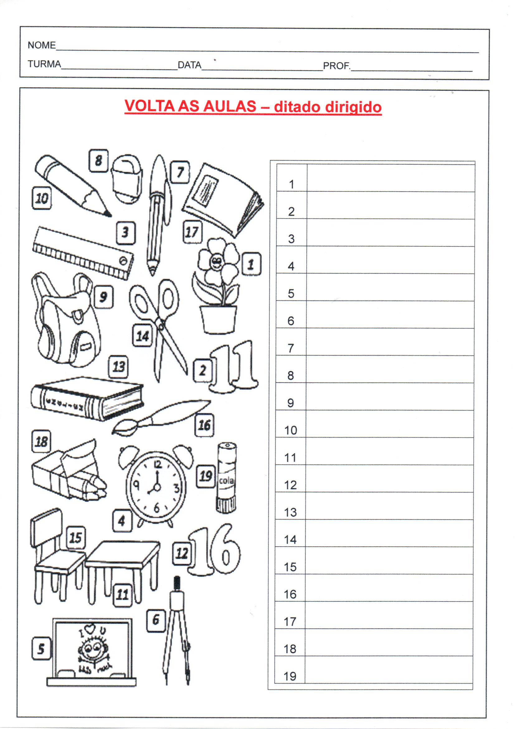 Volta às aulas-Ditado dirigido é uma Atividade para observar cada figura e número e escrever os nomes corretamente.